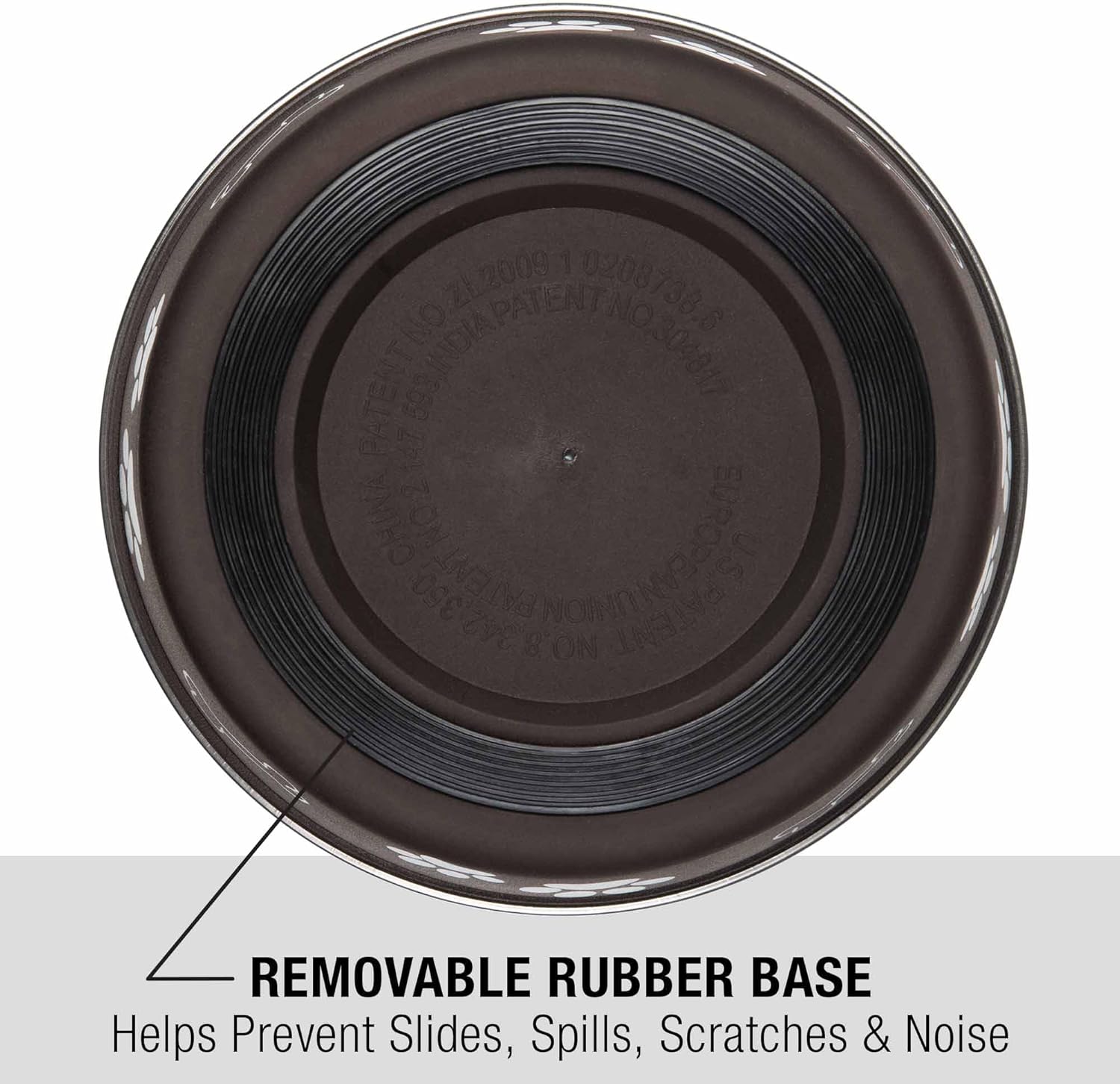 - Veterinarian recommended stainless steel interior. Removable soy-based rubber ring prevents spills and reduces noise. Dishwasher safe; remove rubber ring before washing. Available in five colors and 4 sizes to fit any decor1-Quart bowl