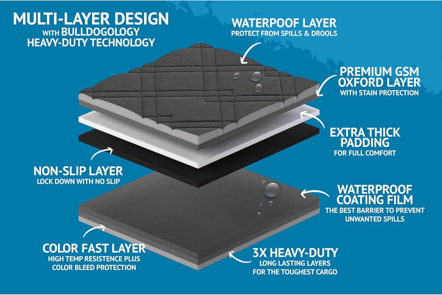 - Premium Quality: Bulldogology designed premium pet cargo seat covers that's modern and easily matches your vehicle interior. Each cargo cover is incredibly strong and padded with thick materials thatโs made for long-term use. It is the ultra-protection cover while providing a more comfortable ride for you and your pets. Infused with Color-Fast layers preventing color bleeding, Free of AZO dyes, and can withstand extreme temperatures without damaging your vehicle.