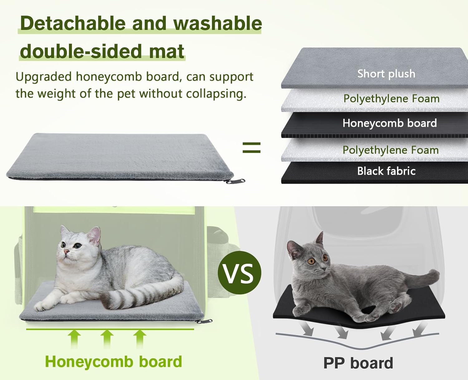 - γ GREAT VENTILATION & VISIBILITY & COMFORT γ: A 3-panel acrylic board design can provide excellent light transmission and visibility. 4 ventilation holes are located on both sides and at the top with a breathable mesh, ensuring airflow and no sultry heat. To enhance comfort, the pet cushion is placed inside the bag's bottom and has a removable, washable cover. This ensures your furry friend has a spot to rest while on the go.