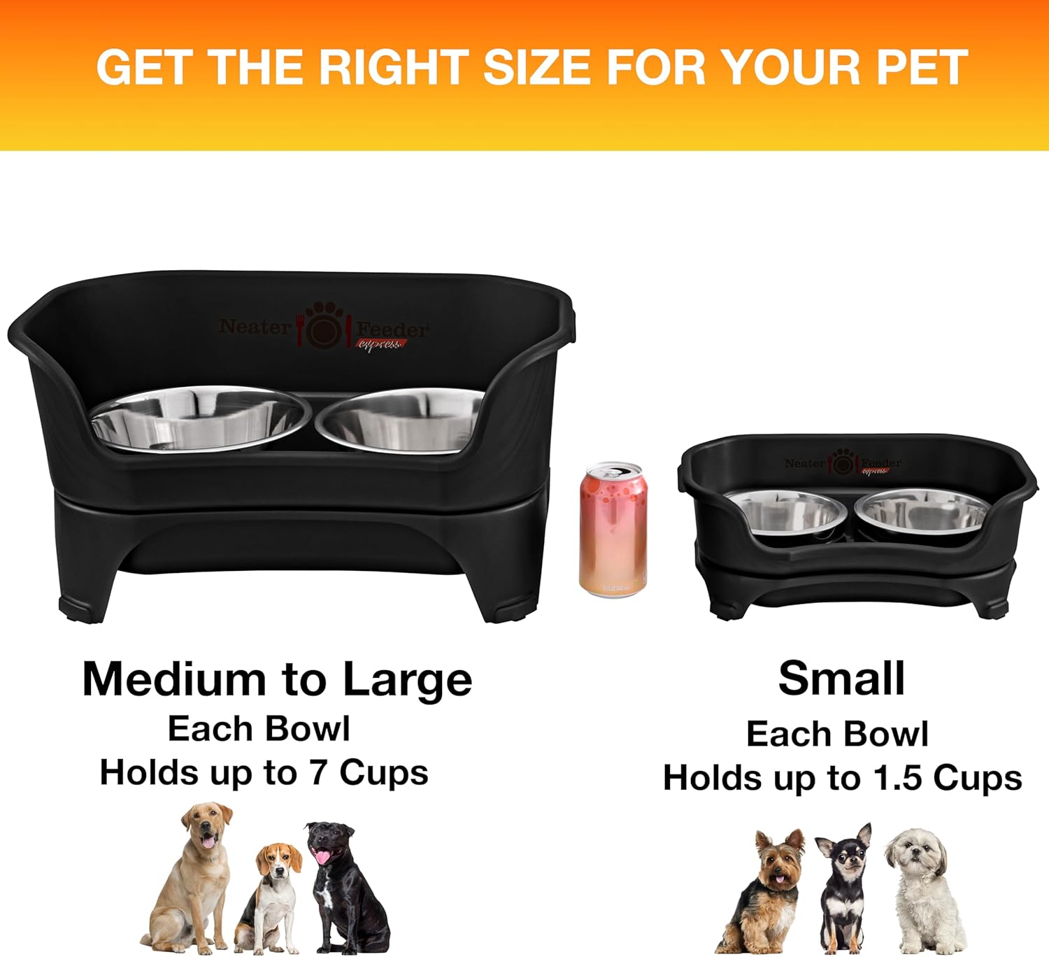 - MADE FOR SMALL DOGS: Our spill-proof elevated dog bowls are designed for small dog breeds under 9 inches at the shoulder & 15 pounds in weight. The feeding height of this model is 2.75” tall. Includes two stainless steel dog bowls, each with a 1.5-cup capacity. NOTE: The Neater Feeder Express is NOT compatible with any leg extensions. If you want to add leg extensions to your raised dog feeder, please check out our Deluxe model.