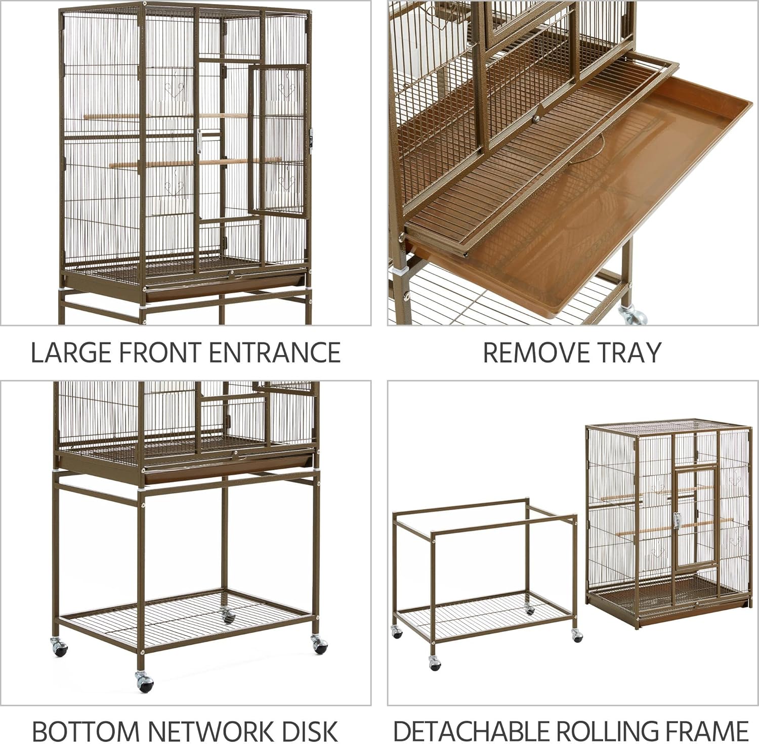 - Mobile Large Bird Cage: Equipped with 360° swivel wheels, this parrot cage glides easily from room to room. Use it with the stand or place the cage directly on a table—flexible for any setup