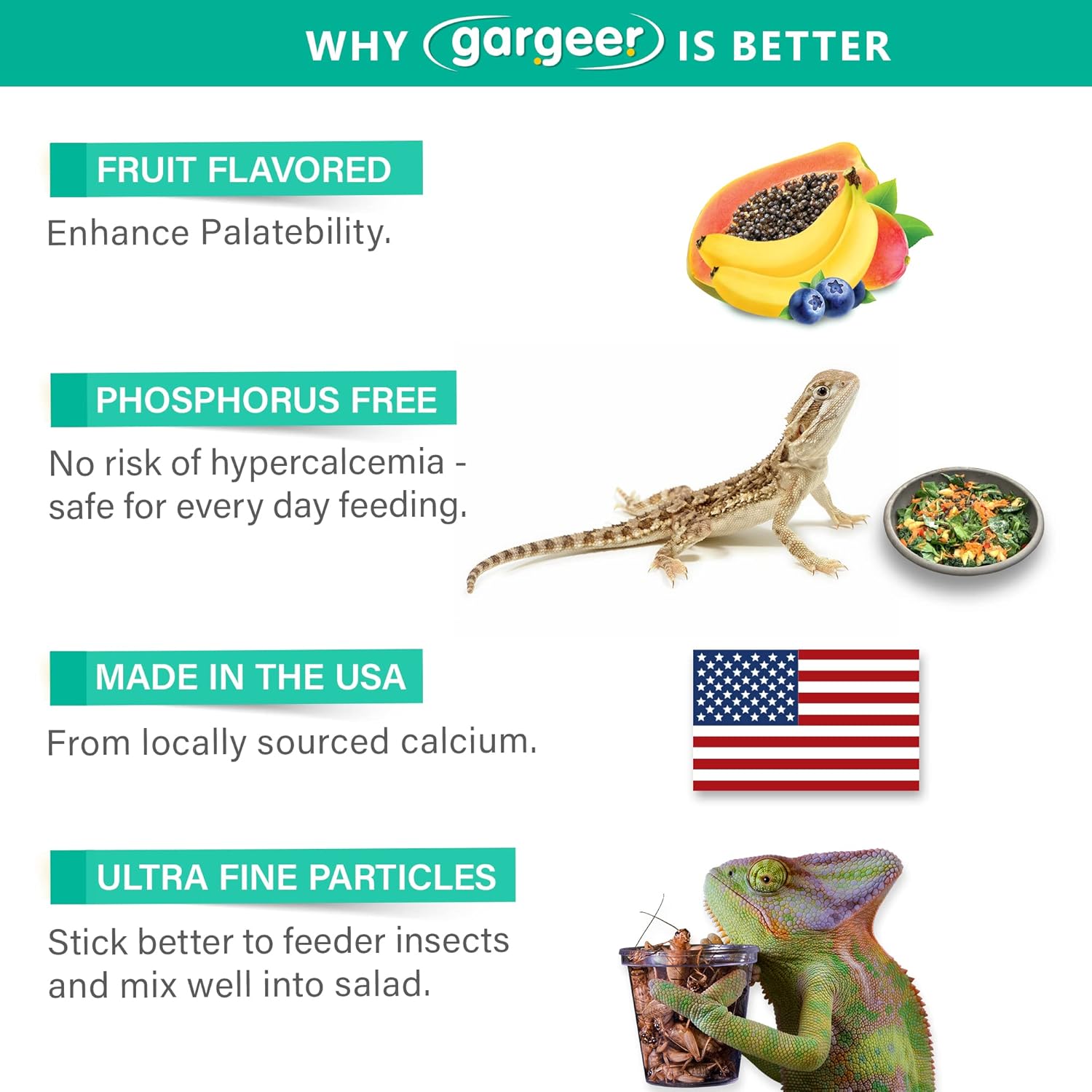 - US BORN AND RAISED. Free from phosphorus and other impurities, Gargeer formula is Proudly Made in The USA from locally sourced calcium. If you and your reptiles are happy, we are happy! Ping us with any calcium questions you have, and weโll do our best to respond promptly. Enjoy!
