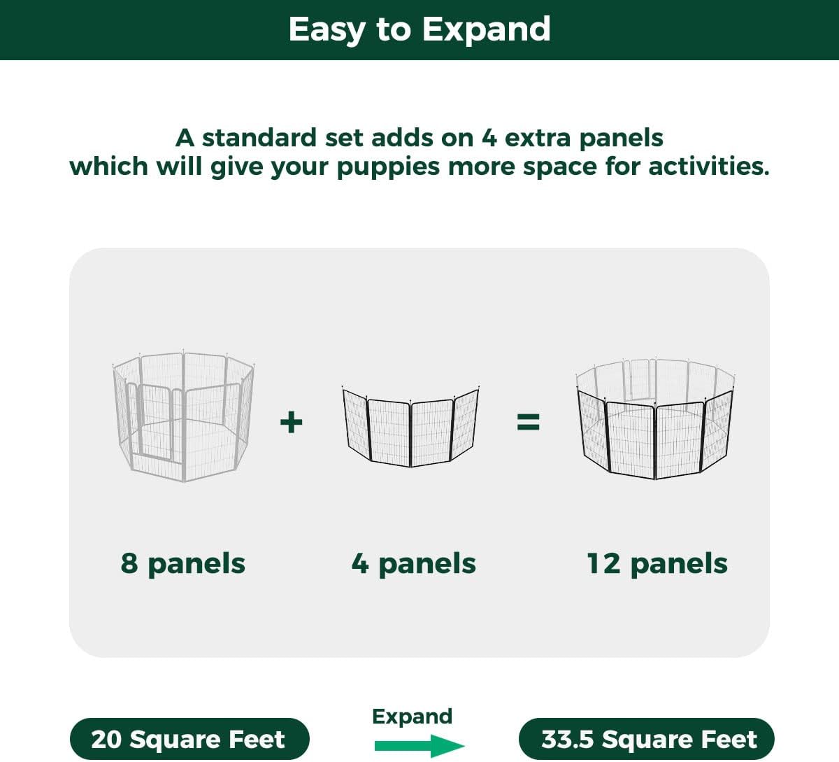 - Super easy to assemble: It won’t take you more than 5 minutes to assemble these portable dog fences as well as pack them away due to the rod-connected design. Meanwhile, panels can be added or removed freely to give you a fully flexible area and arrange the dog pen in any shape you need.