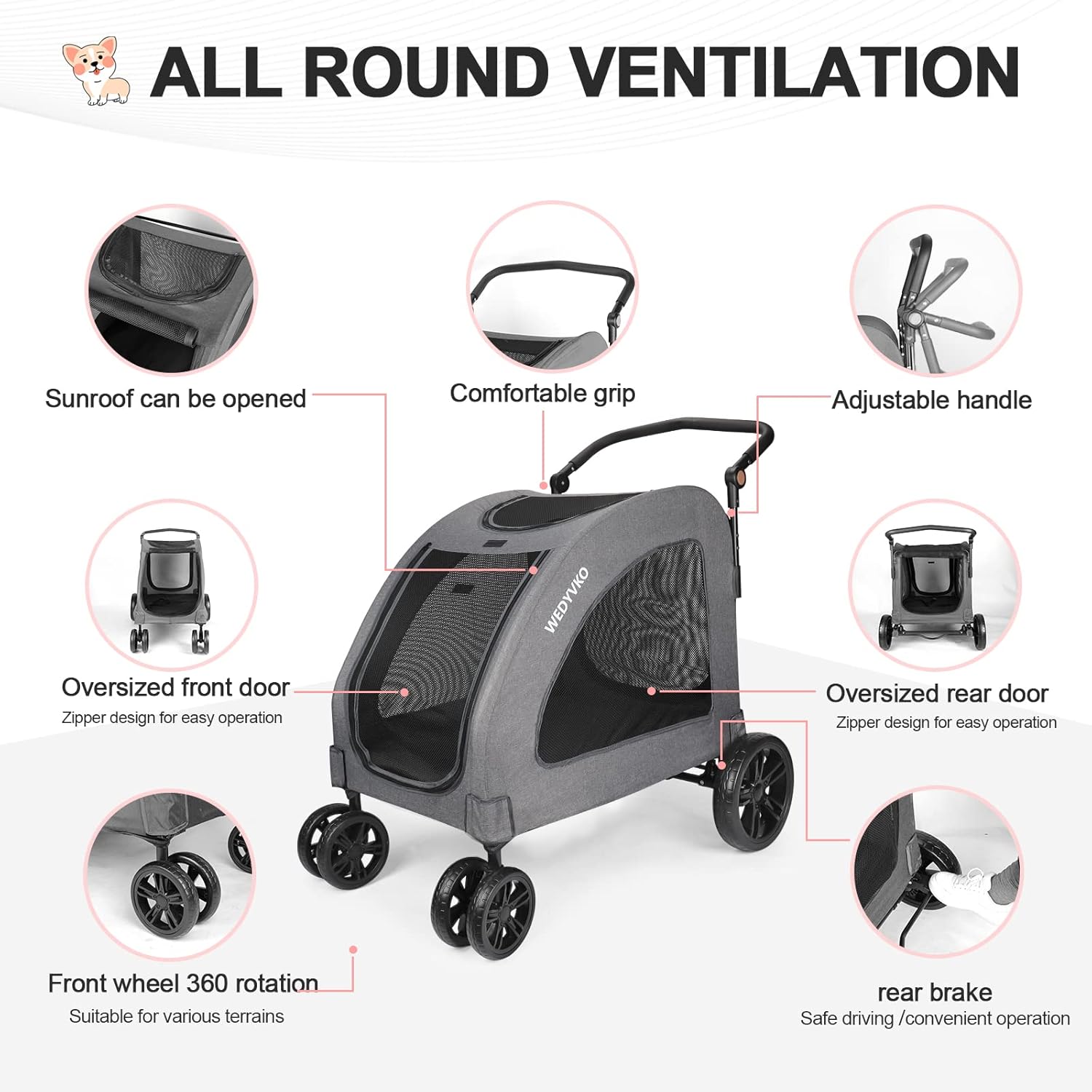 Large Dog Travel Stroller with 4 Heavy Duty Wheels Pet Stroller with Adjustable Handle - Double Doggie Capacity Jogger Wagon with Back Front Door for Small Medium Large Dogs (Dark Light Gray)