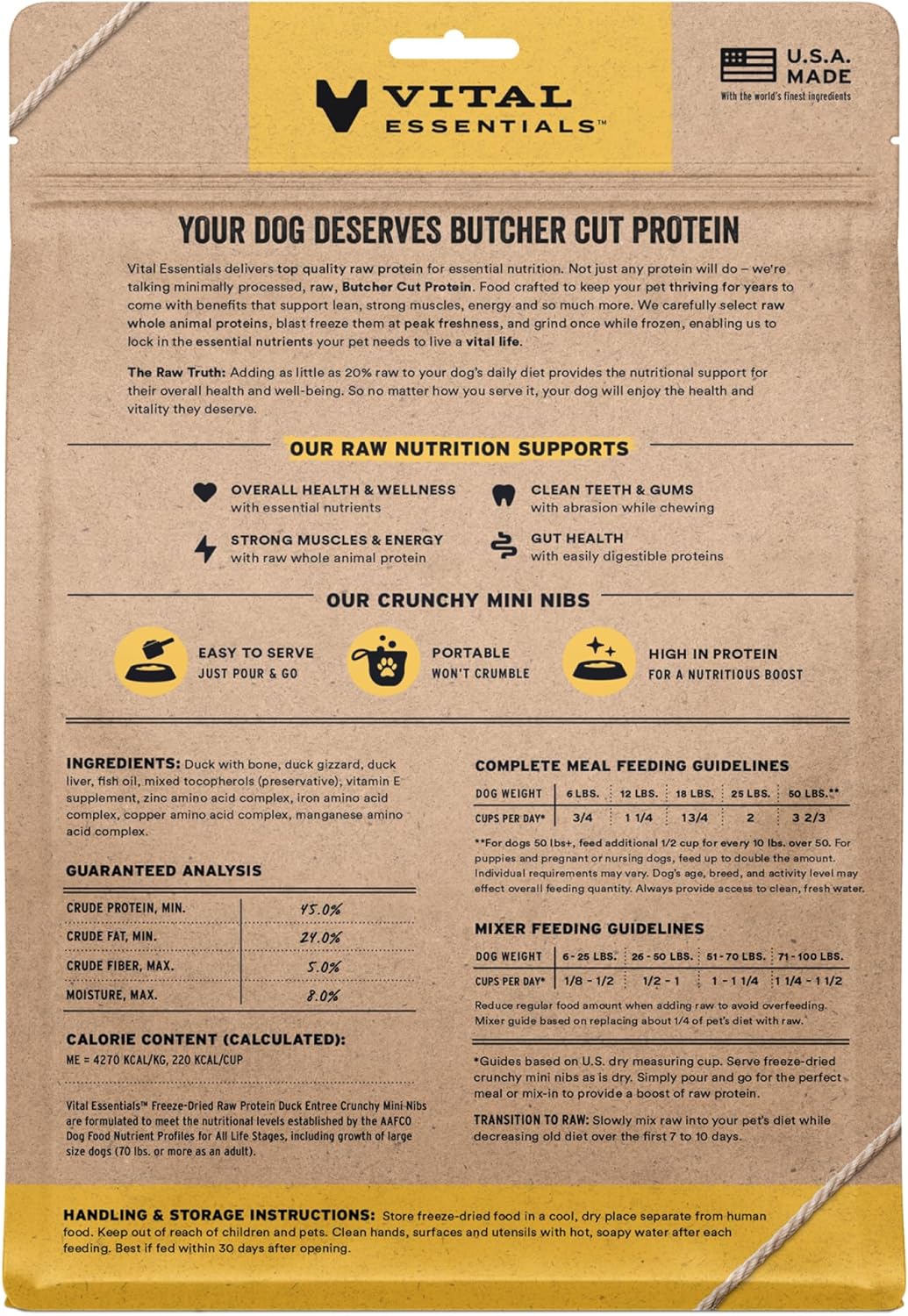 - CRUNCHY FREEZE-DRIED RAW DUCK DOG FOOD: Vital Essentials Crunchy Freeze Dried Dog Food packs more protein than industry standard into every bite to deliver the peak vitality your dog deserves, especially when compared to dehydrated dog food. This complete and balanced freeze-dried raw dog food is made with premium butcher cut duck, responsibly sourced in the EU.