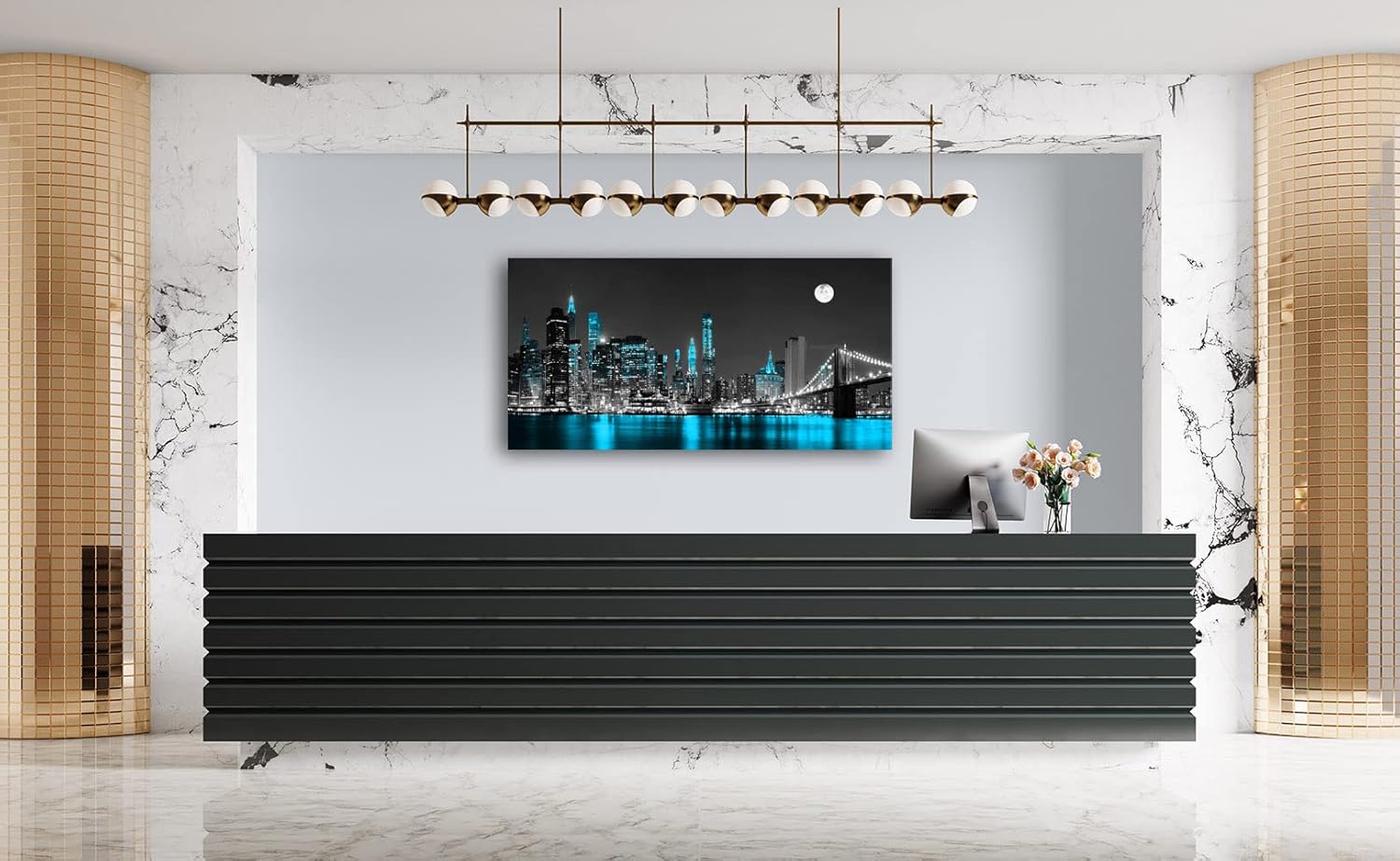 Jiuqinghua Wall Art Decor Canvas Print Picture 1 Panel Black White and Blue New York Brooklyn Bridge Cityscape Night Building Painting for Kitchen Office Home Decor Framed Ready to Hang 20x40inch