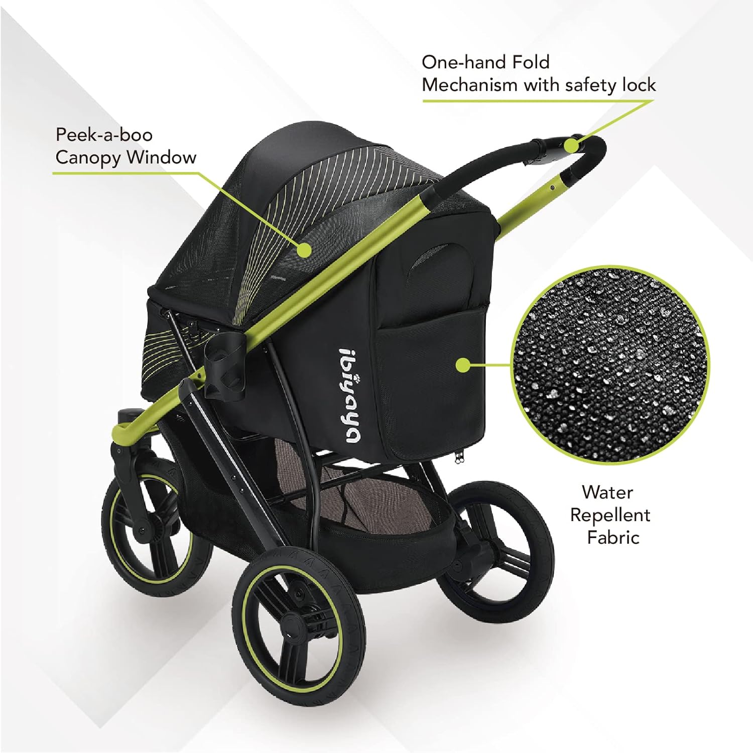 - STORAGE OPTIONS: Choose this large dog jogging stroller, and we assure you โ you wonโt have to bring several bags the next time you go out with your pet. Ibiyayaโs Beast Pet Jogging Stroller has several storage options, so you can bring your petโs and your own valuables with ease. This all-terrain pet stroller has a large, durable bottom basket, storage pockets made from mesh, and a bottle holder on the side. Talk about hands-free trips, right?