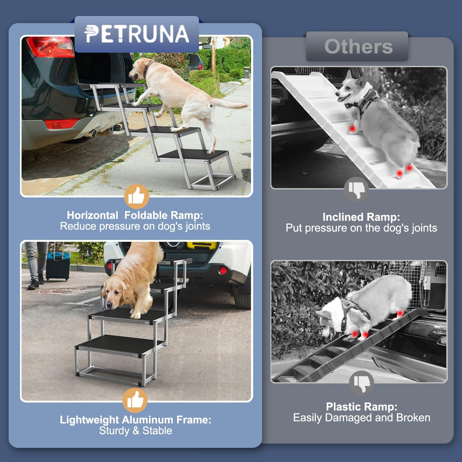 - Enhanced Durability and Upgraded Weight-Bearing Capacity: Each step of the PetRuna Dog Ramp features a rust-resistant, high-grade metal with additional load bars for a durable step that can support up to 250 pounds. It's the perfect gift to protect your pet's joints and knees from injury, keeping them safe and comfortable. The handle with foam can increase friction, provide a double layer of security for the stability of the collapsible dog steps for the car, and also help to avoid scratching the car trunk. The perfect gift for our pets, to protect their joint knee from injury.