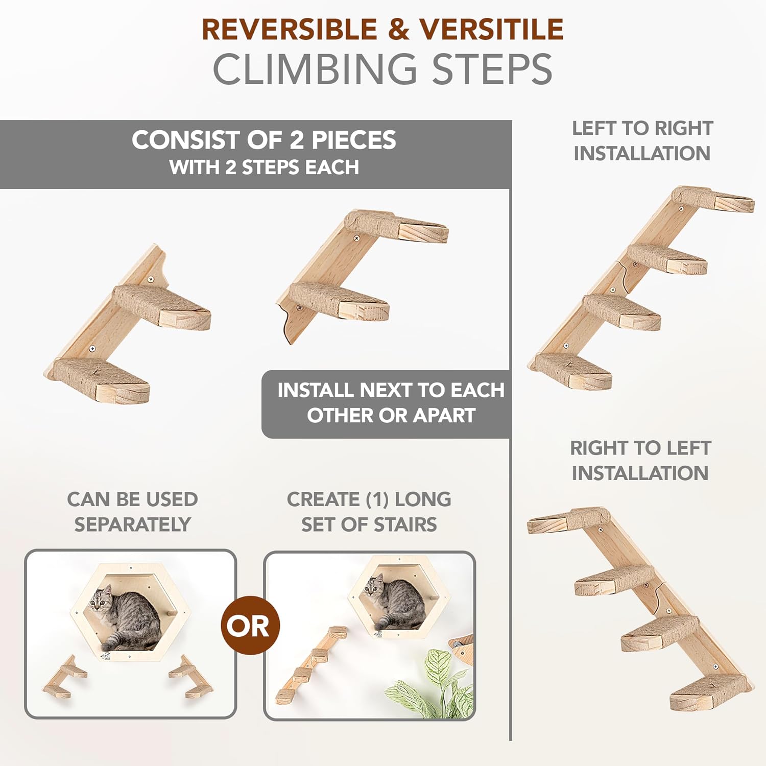 - ๐พMODERN DESIGN: Elevate your home decor with our space-saving cat shelf. The cat steps offer flexibility with a reversible design (install left-to-right or right-to-left) and are wrapped with durable jute ropes, making them highly resistant to cat scratching.