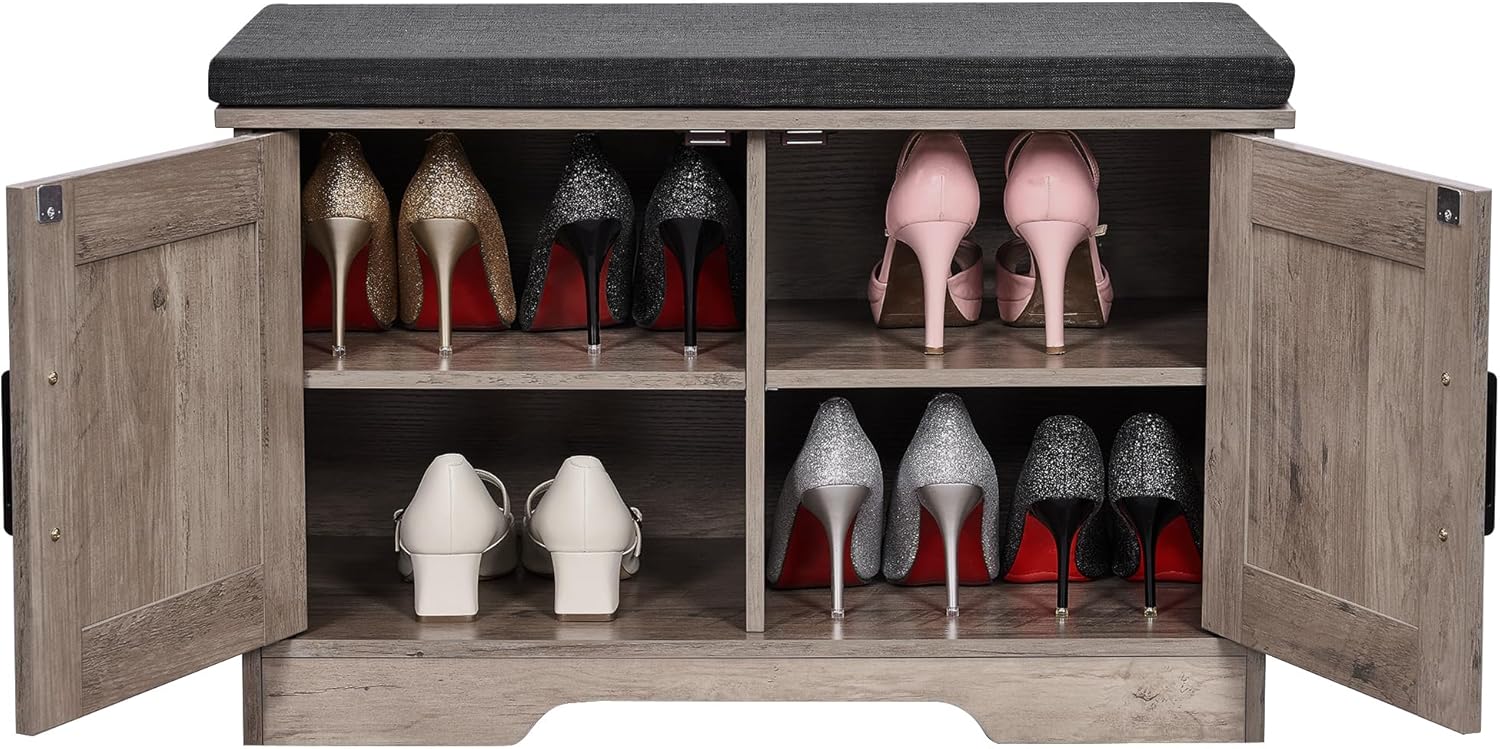 2-Tier Storage Bench, Shoe Bench with Padded Seat Cushion, Entryway Bench with 2 Barn Doors, Adjustable Shelf, 13.8" D x 27.6" W x 17.7" H, for Entryway, Living Room, Bedroom, Greige