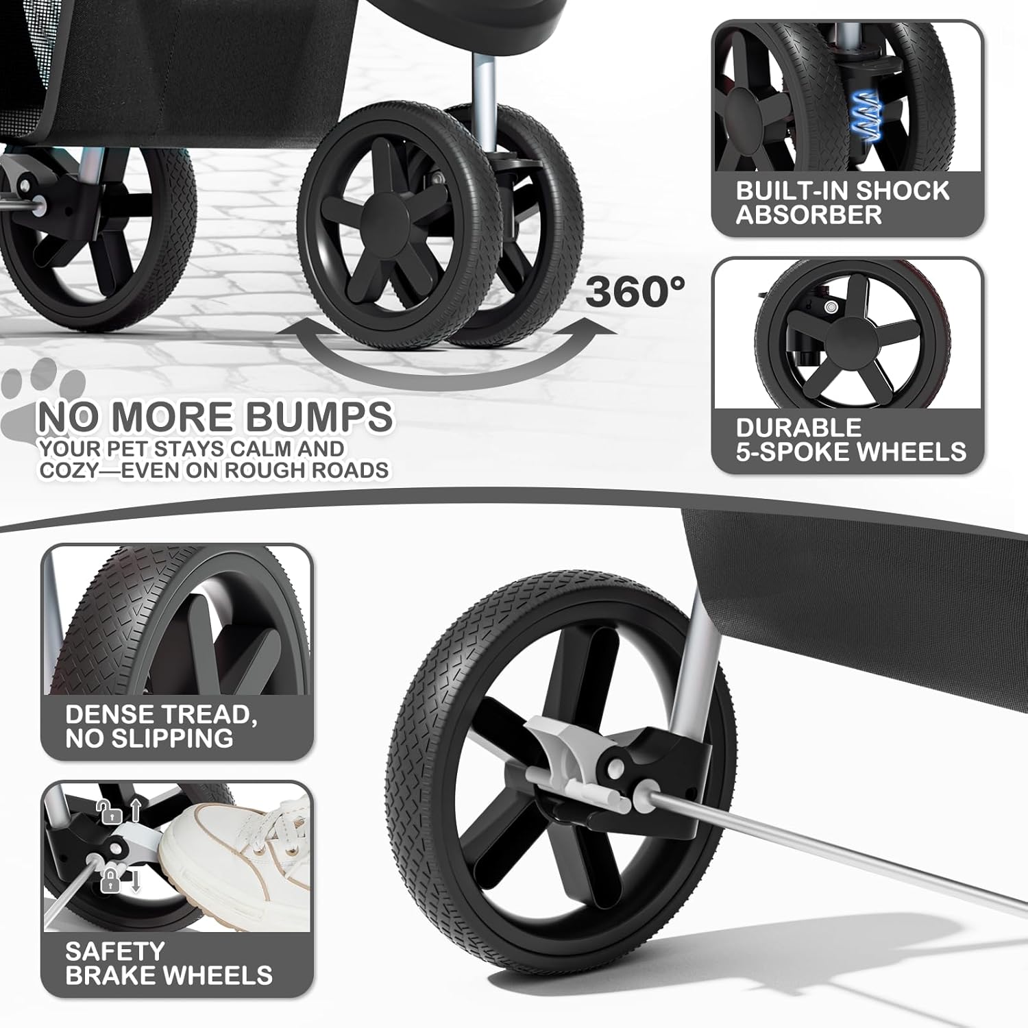 - Flexible Wheels - Finally, the 360Β° swiveling front wheel with a shock absorber ensures that your pet has a smooth ride even on the roughest terrain. The rear two wheels also feature brakes, making this stroller a perfect fit for injured or senior dogs or puppies that need a little extra TLC.
