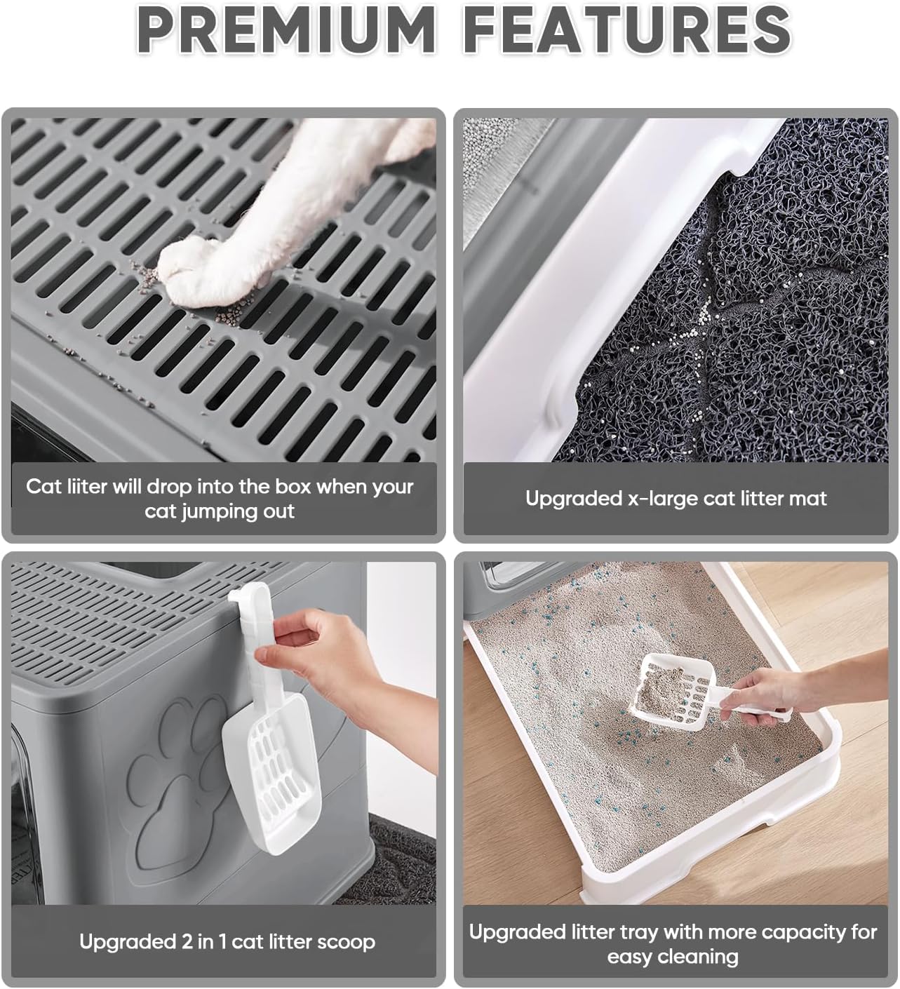 Cat Litter Box with X-Large Litter Mat and Scoop, Large Foldable Litter Box with Lid, Enclosed Kitty Box,Front Top Entry Exit, Odor Control Easy to Clean (Upgrade Dark Grey)