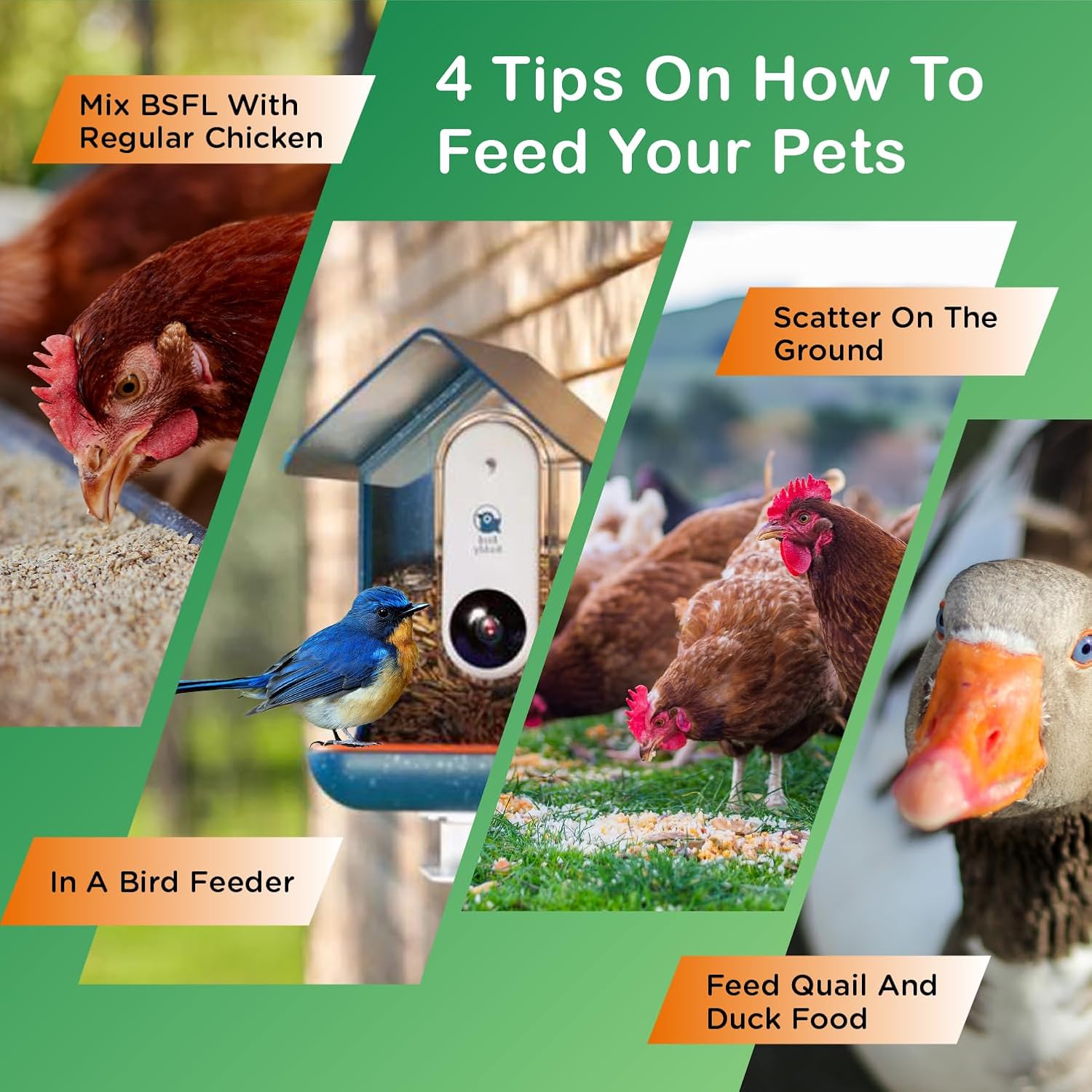 - Rich in Calcium & Essential Nutrients β Black soldier fly larvae are naturally rich in calcium, essential amino acids, and minerals such as phosphorus and magnesium. These nutrients support healthy feather growth and stronger eggshells, while being lower in fat than many other protein sources