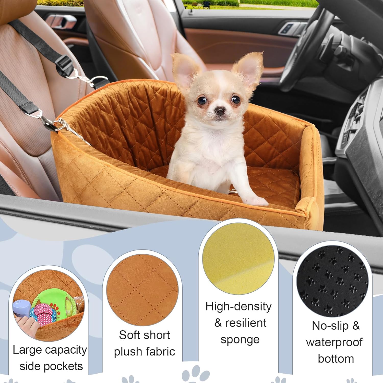 - Comfortable and Secure: The pet car seat is made of high-quality breathable fabric with a super soft plush rim, providing plenty of room for small dogs to readjust and get comfortable. The firm foam construction maintains its shape, offering a soft and cozy place for your dog to relax in extreme comfort. The non-slip bottom and safety tethers ensure that both your dog and the seat stay securely in place, preventing any sliding around while driving.