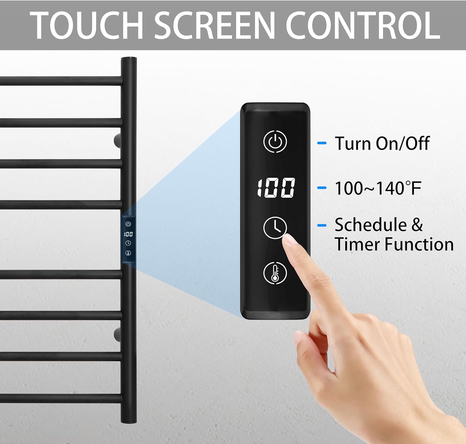 - [TOUGH SCREEN CONTROL]: Manually to turn on/off anytime. Countdown Timer function from 1 hour to 8 hours. Temperature control from 100Β°F to 140Β°F.