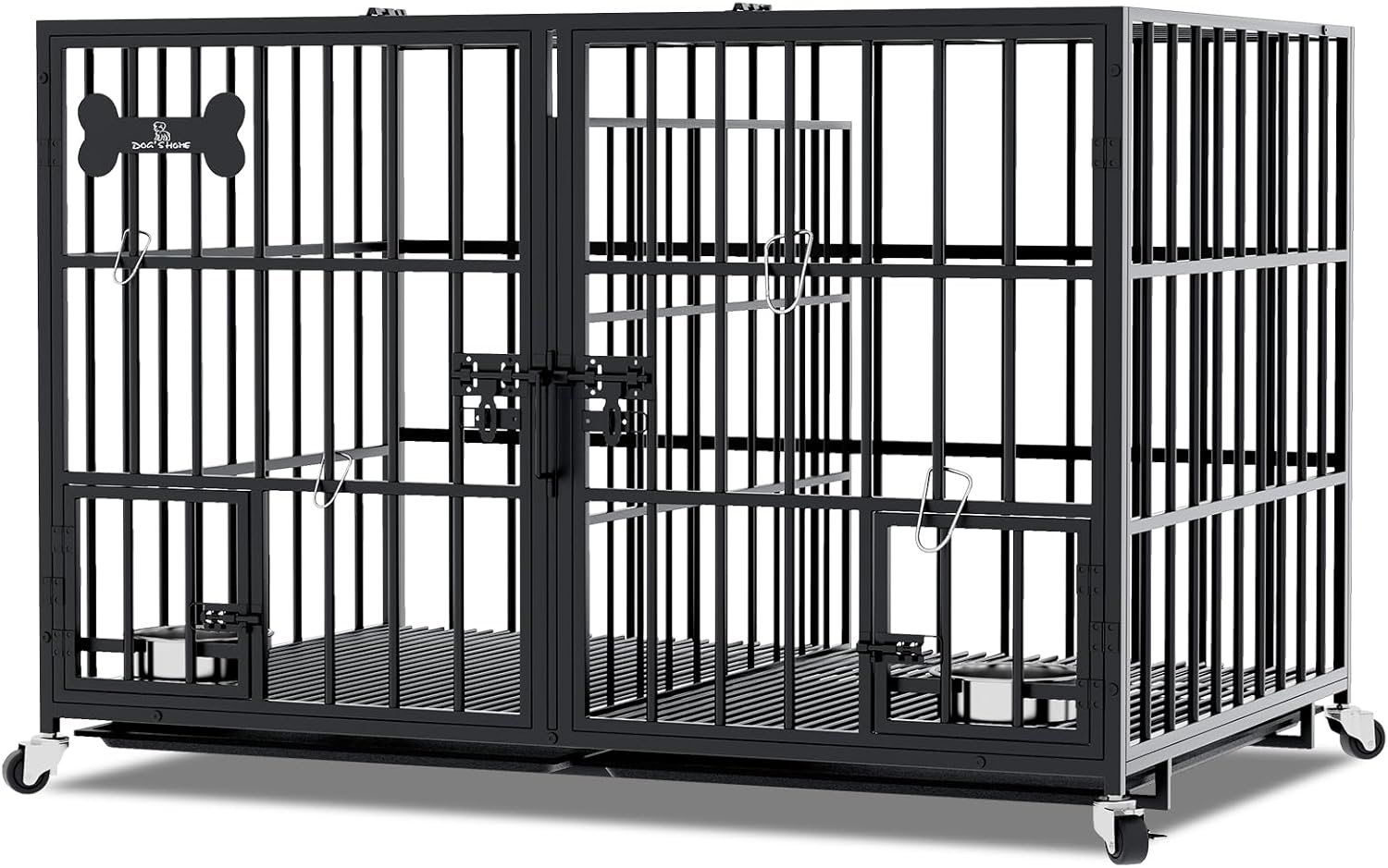 aboxoo 42/48 inch Heavy Duty Metal Dog Crate for 2 Dogs/Large Dog,All Metal Open Top Stackable,Dog Kennel Indoor with Wheels,Floor Grid, Tray, Divider and Feeding Bowl