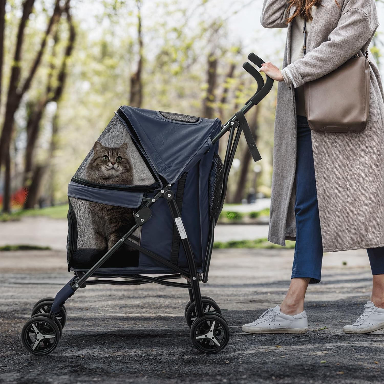 MoNiBloom 4 Wheels Pet Stroller, Easy-Fold Puppy Cage Jogger Stroller with Sun Cover, Pad and Rear Storage Bag, Breathable and Visible Mesh for Small/Medium Pets up to 22 lbs, Navy Blue