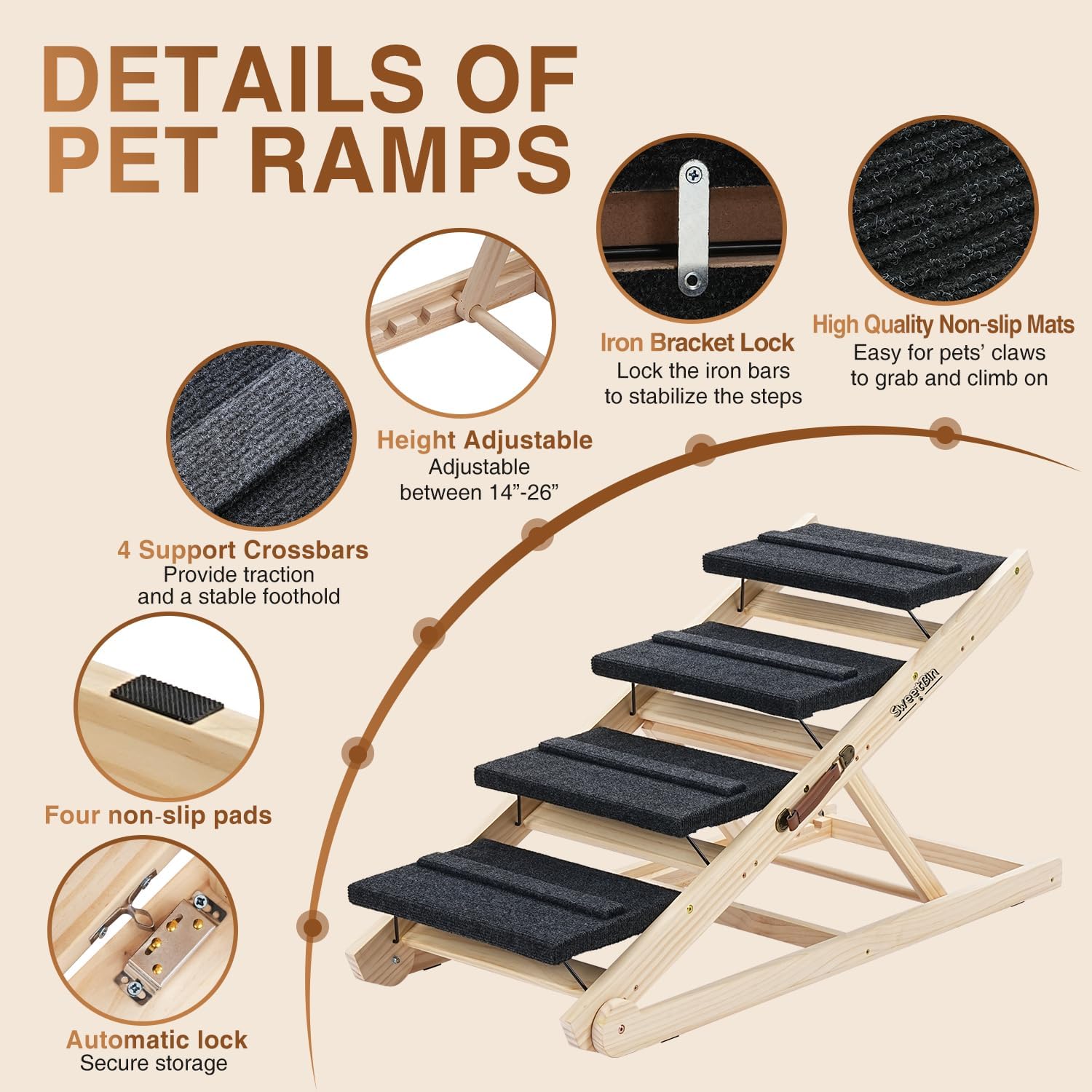 - โ ANTI-SLIP SAFETY FEATURES - Our wooden dog ramps are thoughtfully crafted to alleviate muscle and joint strain. The non-slip fabric cover provides traction for pets' paws, with 4 anti-slip crossbars preventing sliding on inclines. Designed with bottom anti-slip pads, our pet steps offer protection for your floors.
