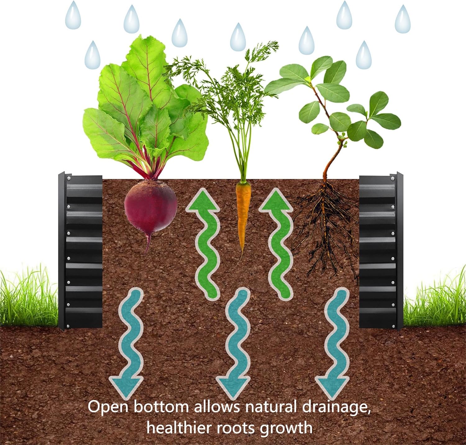 - OPEN BOTTOM: Sits on the ground garden bed, allows natural drainage, prevent waterlogging and root rot. It encourages the plantsโ roots to grow deep into the ground, promoting stronger and healthier plants.