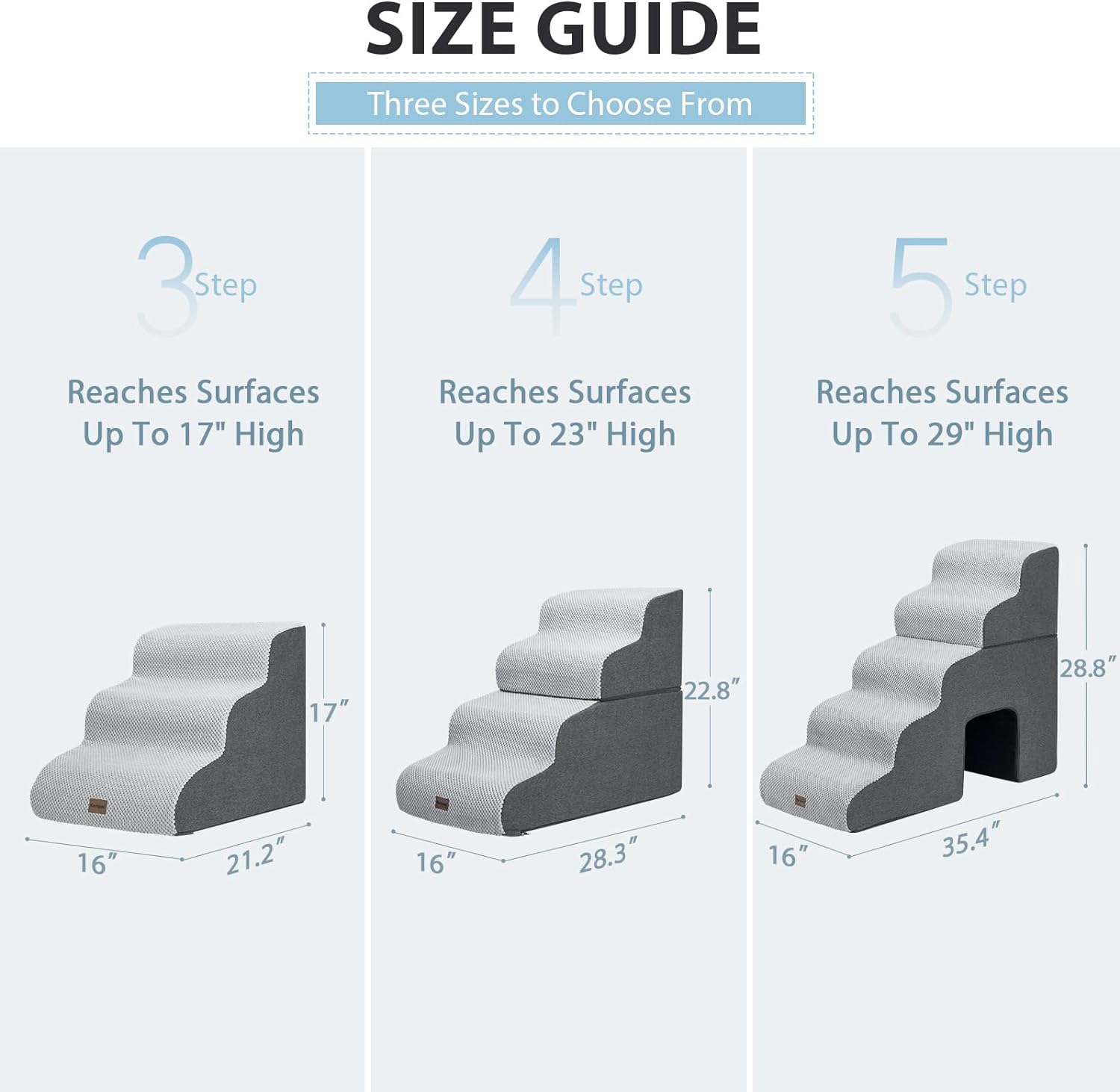 - MULTIPLE STEP SIZES - This pet stair has 3 steps, 4 steps and 5 steps to choose. Our 3-step stairs fit chair/sofa/bed up to 20inch. 4-step stairs fit chair/sofa/bed up to 24inch. And 5-step stairs with a hole for pets to play fit chair/sofa/bed up to 28inch.