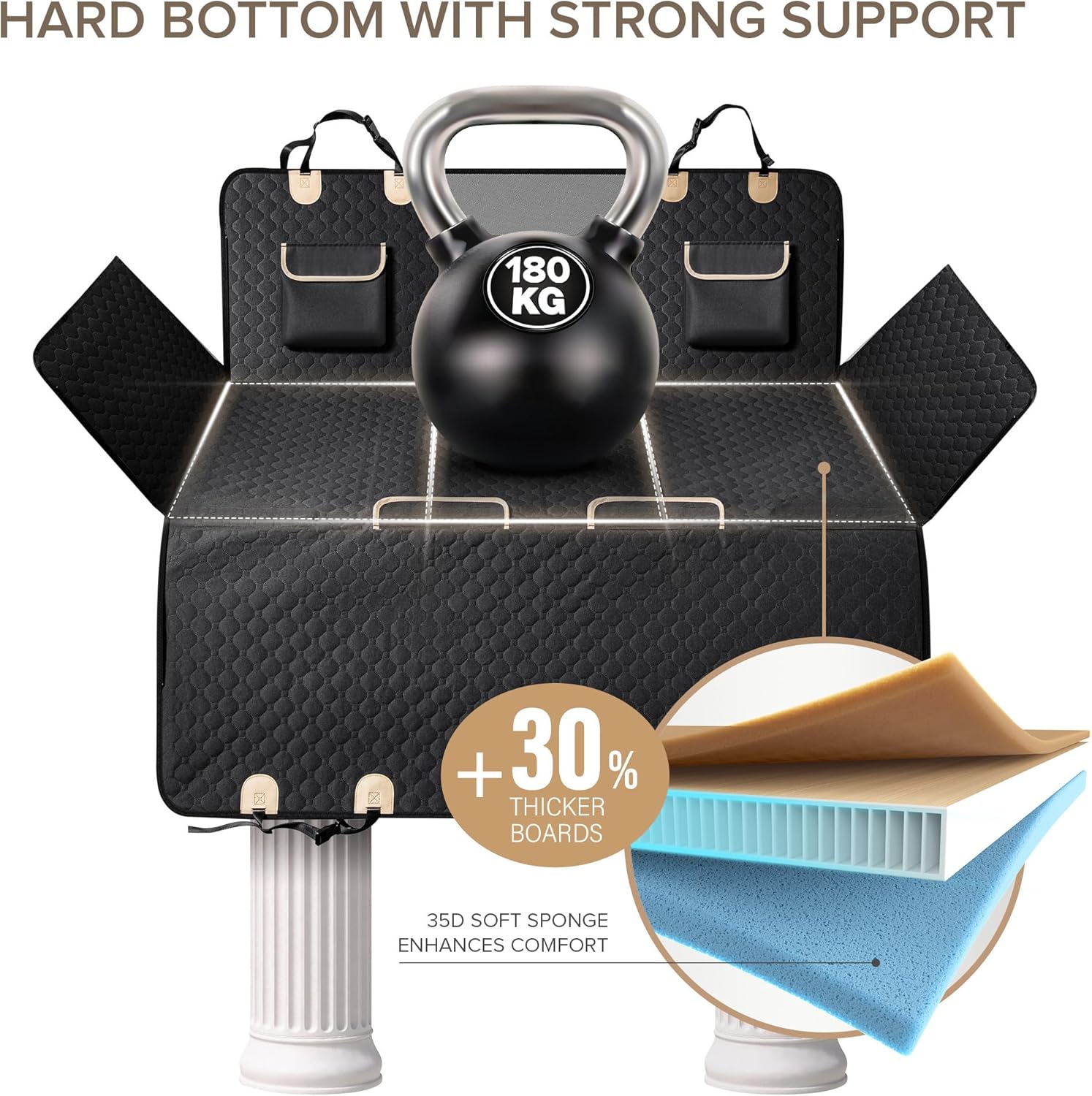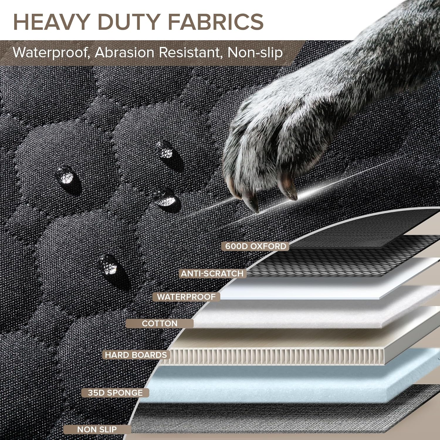 - 7-LAYER MATERIALS FOR STRONG SUPPORT, PROTECT AND COMFORT - Constructed with heavy duty materials including 600D scratch-resistant Oxford, waterproof fabric, thickened hard bottom boards, 35D soft sponge and cotton layers for added comfort and non-slip fabric that wouldnโt slide. Pet seat cover for back seat safeguards trucks from wear, water, and stains, extra-high door protector prevents scratches, allowing dogs to hop in and out joyfully, leaving you with perfectly preserved interio