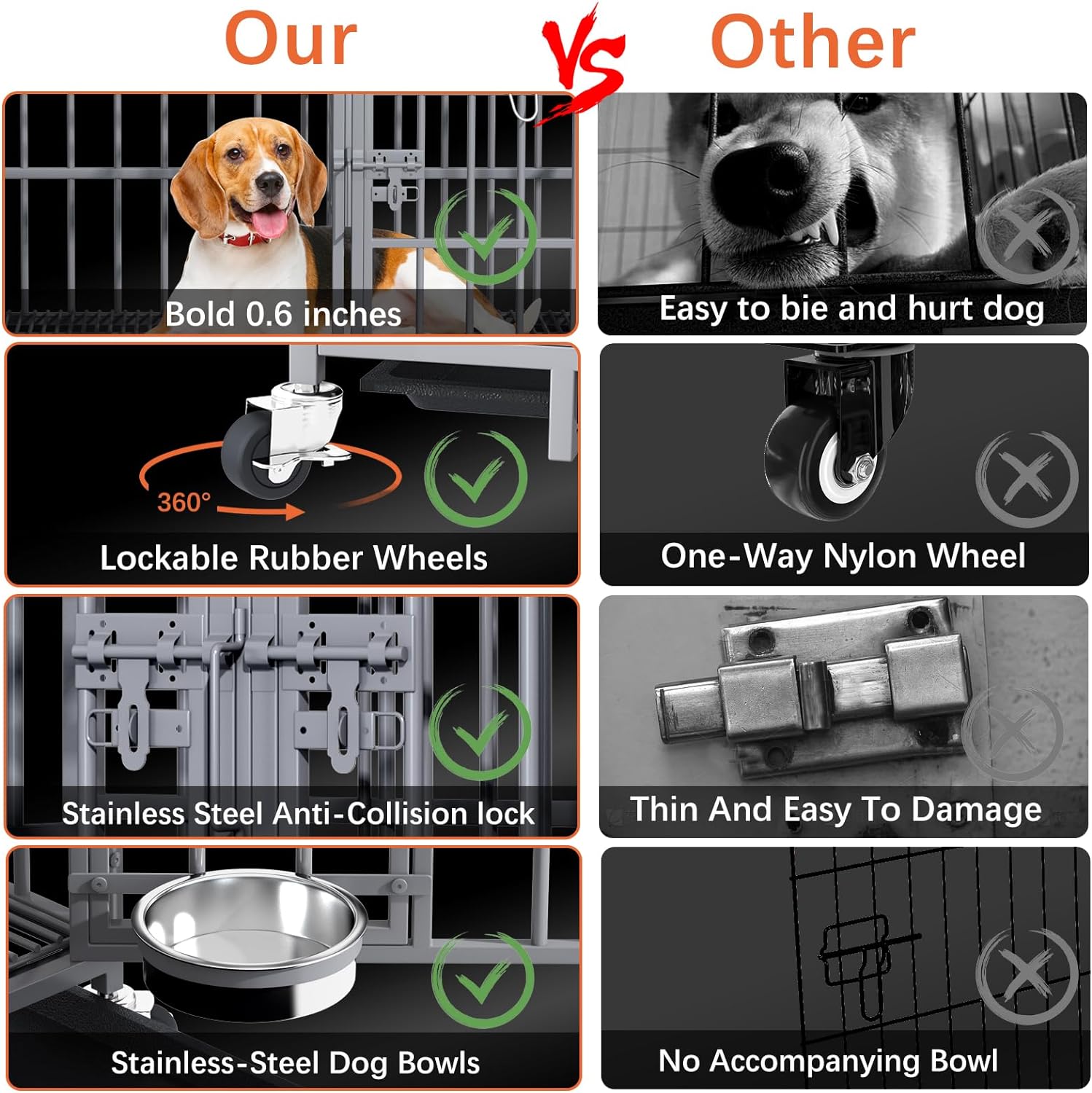 - ใEasy Access & FeedingใThe dog crate has double doors and a reversible top for easy access almost anywhere. The top is open for easy access. The kennel is additionally designed with 2 small feeding doors with locks. These doors allow quick and easy access to the stainless steel dog bowl, swing bowl, without having to open the front door for easy feeding. The dog kennel double door design is not only easy to get in and out of the kennel, but also good for you to interact with and feed your dog.