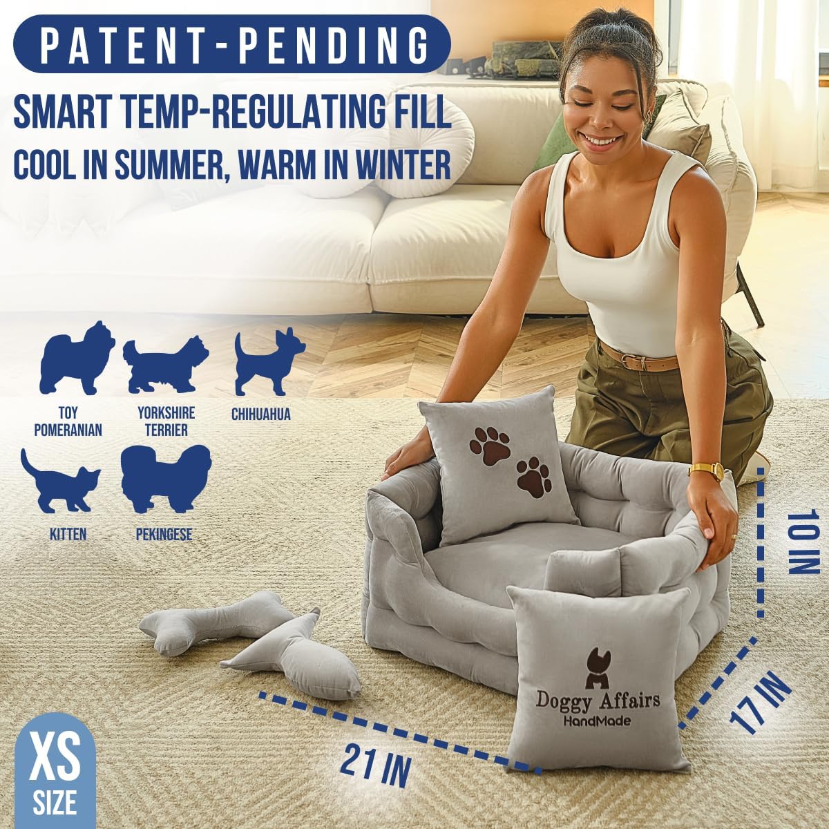 - JOINT SUPPORT COMFORT & TEMP REGULATION: Premium cushioning supports joints, hips, and growing bones, while smart fill keeps her cool in summer and warm in winter. The only calming dog bed that truly hugs her back like your arms.