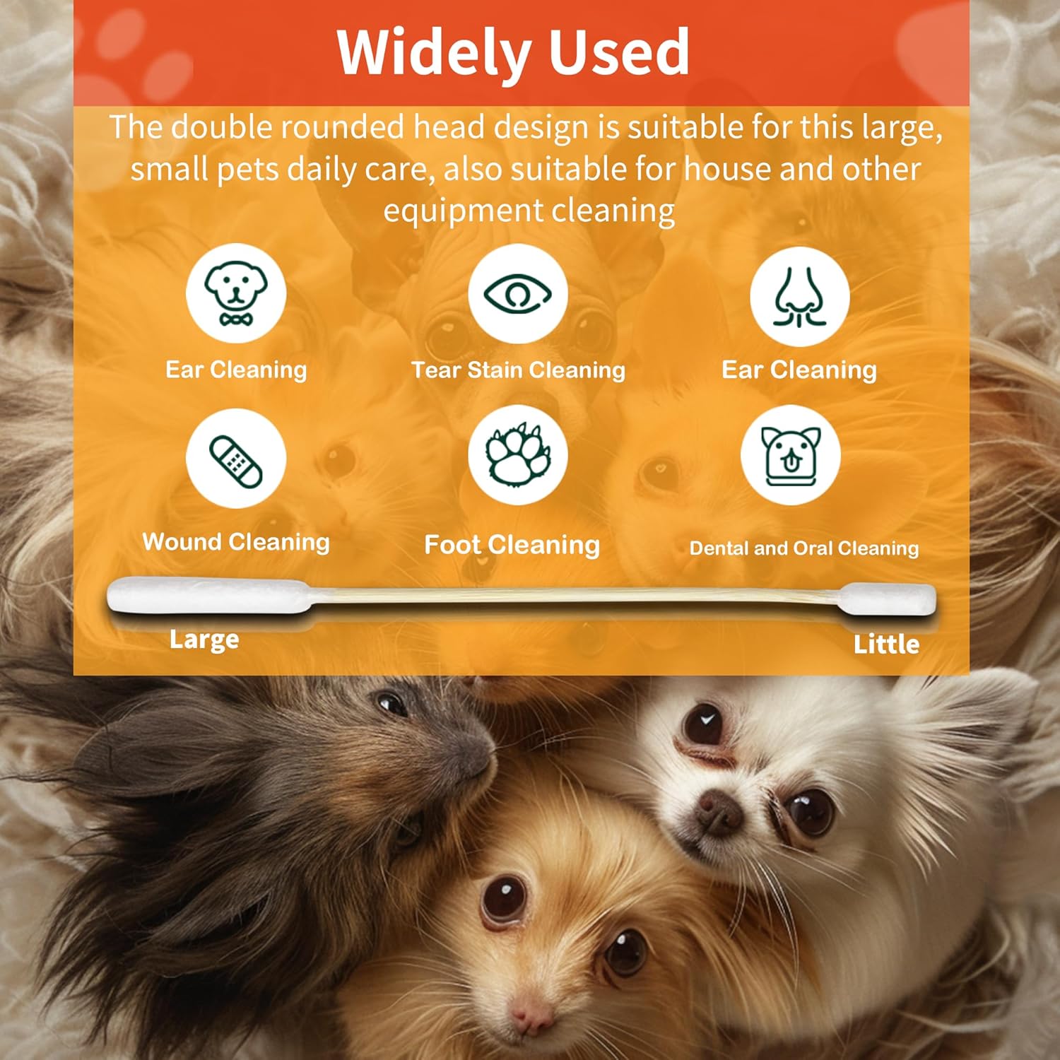 - 【Double Tips】- Our long cotton swab has a small and large tip, one cotton tip is 1.4 inches and the other is 0.7 inches. Not only suitable for cleaning the surface of your pet's ears, but also for cleaning the small folded crevices of the ears. Great for cleaning the ears of your dog, cat or other small pets, large pets