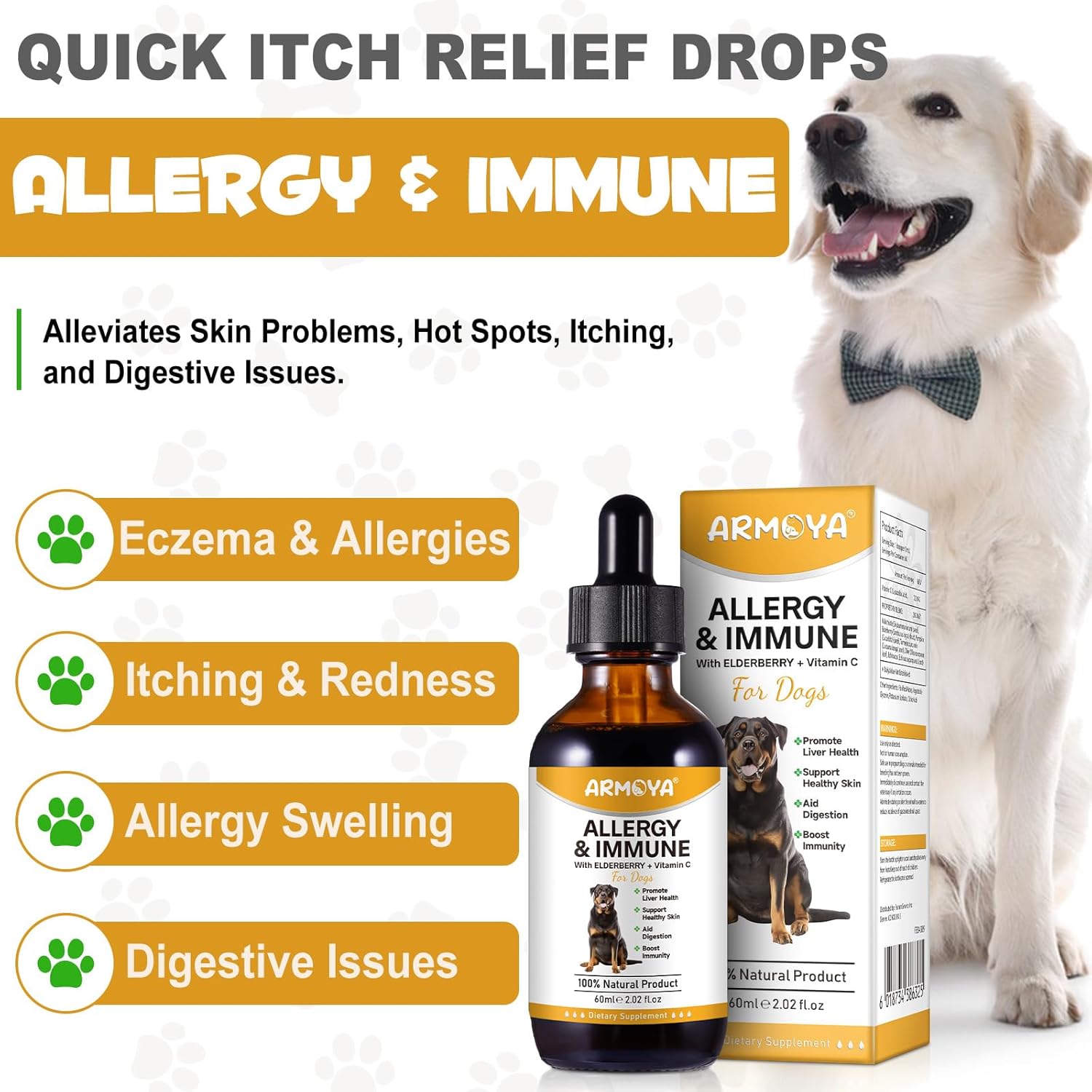 - Overall Wellness: Our ARMOYA Allergy & Immune is a dietary supplement solution for immune and digestive support that enhances your pet’s overall health and vitality with a balanced blend of ingredients for dogs and cats with skin, seasonal and environmental allergy issues