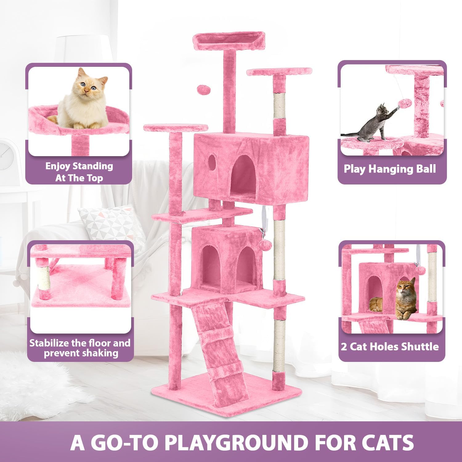 70 inches Cat Tower for Indoor Cats Multi-Level Cat Condos for XL Cat Tree Cat Climbing Tower with Scratching Posts, Hanging Toys,Pink