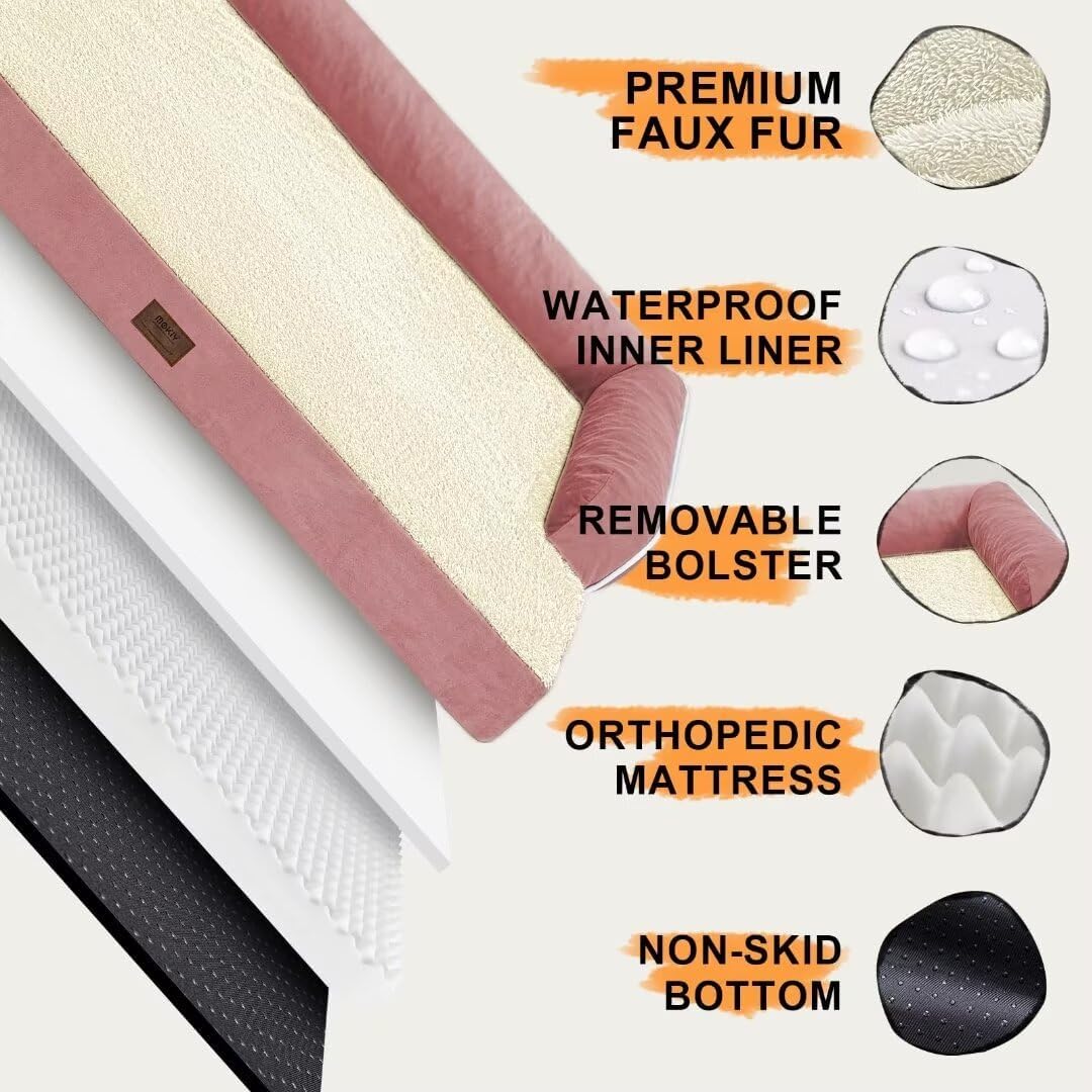 Orthopedic Washable Large Dog Bed, Pink Dog Beds with Removable Cover, Large XXXL Pet Dogs with Bolster, Washable Dogs Beds Sofa with Orthopedic Egg Foam for Medium Large Pet