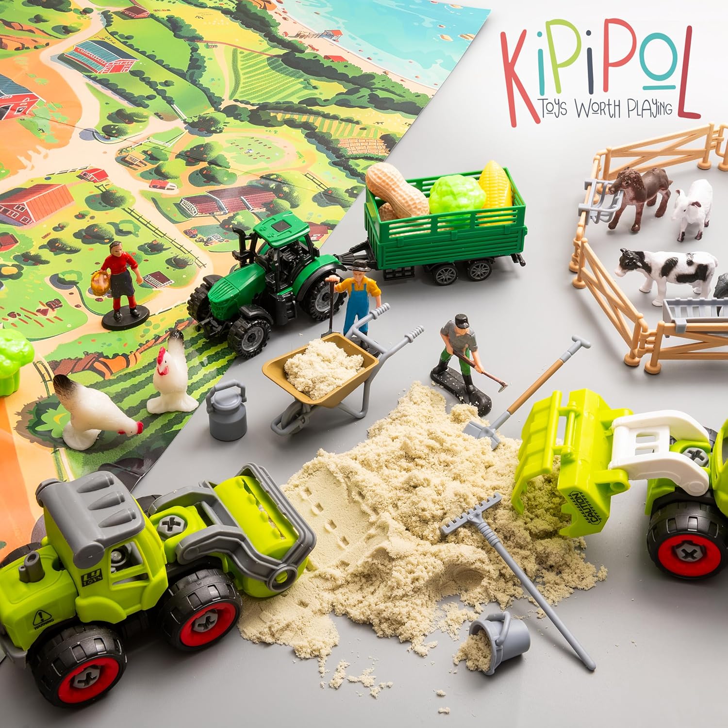 - ALL- IN -ONE FARM SAND KIT: Unleash a world of sensory play with the KipiPol 59-piece farm sand box set! Packed with 2.2 lbs of moon sand, 3 detachable tractors, 3 farm workers, 15 farm animals, 9 veggies, 12 fences, 2 screwdrivers, 11 farm tools, an activity map, and a sandbox with a lidโeverything your little farmer needs for endless toddler activities and sensory fun!