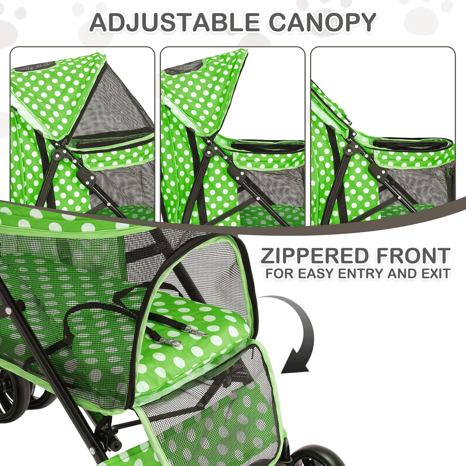 - Adjustable Comfort - Enjoy a customizable and accessible pet strolling experience with our stroller's adjustable canopy, breathable mesh windows, and a cozy padded interior for comfort, complemented by convenient dual-access zippered fronts for easy entry and exit.