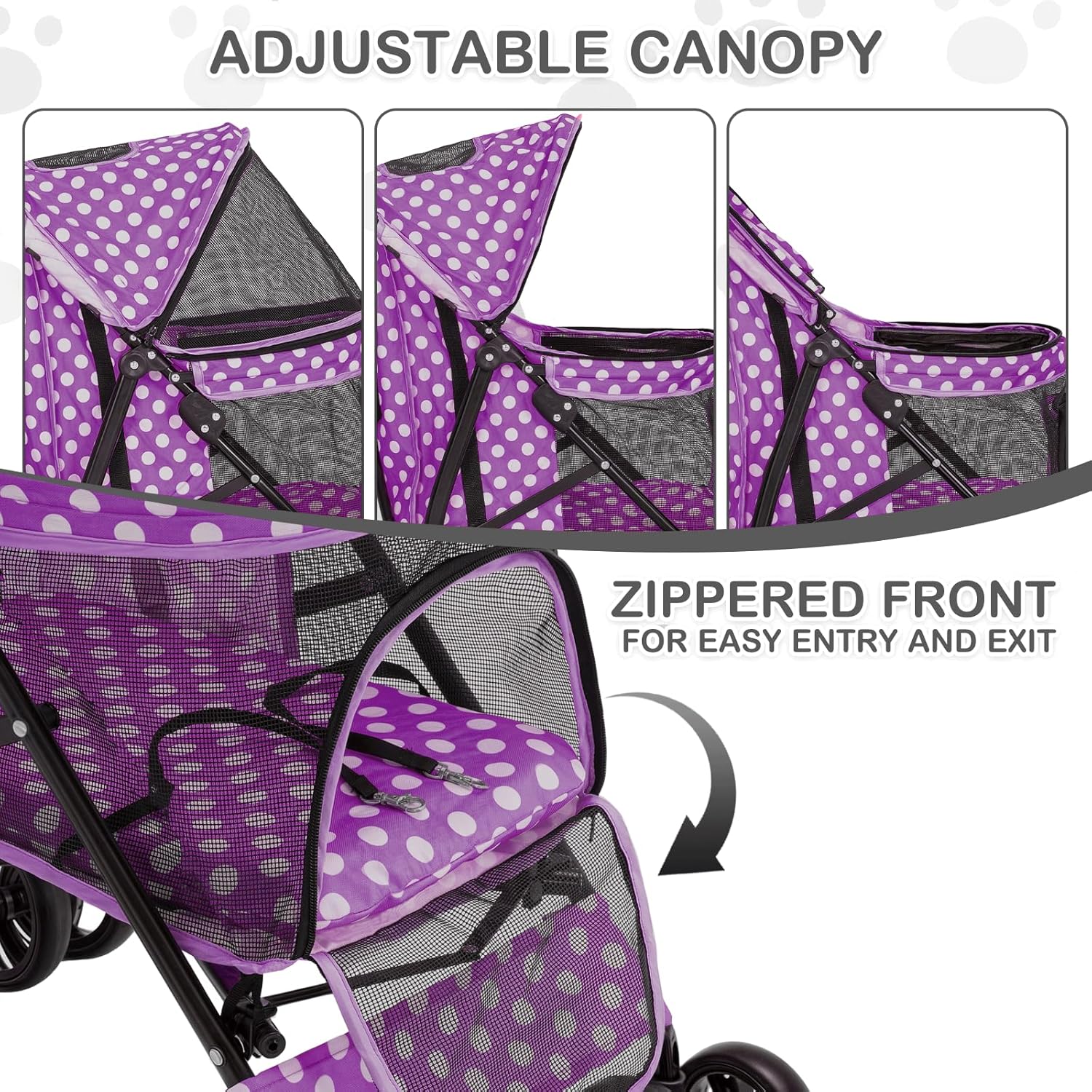 - Adjustable Comfort - Enjoy a customizable and accessible pet strolling experience with our stroller's adjustable canopy, breathable mesh windows, and a cozy padded interior for comfort, complemented by convenient dual-access zippered fronts for easy entry and exit.