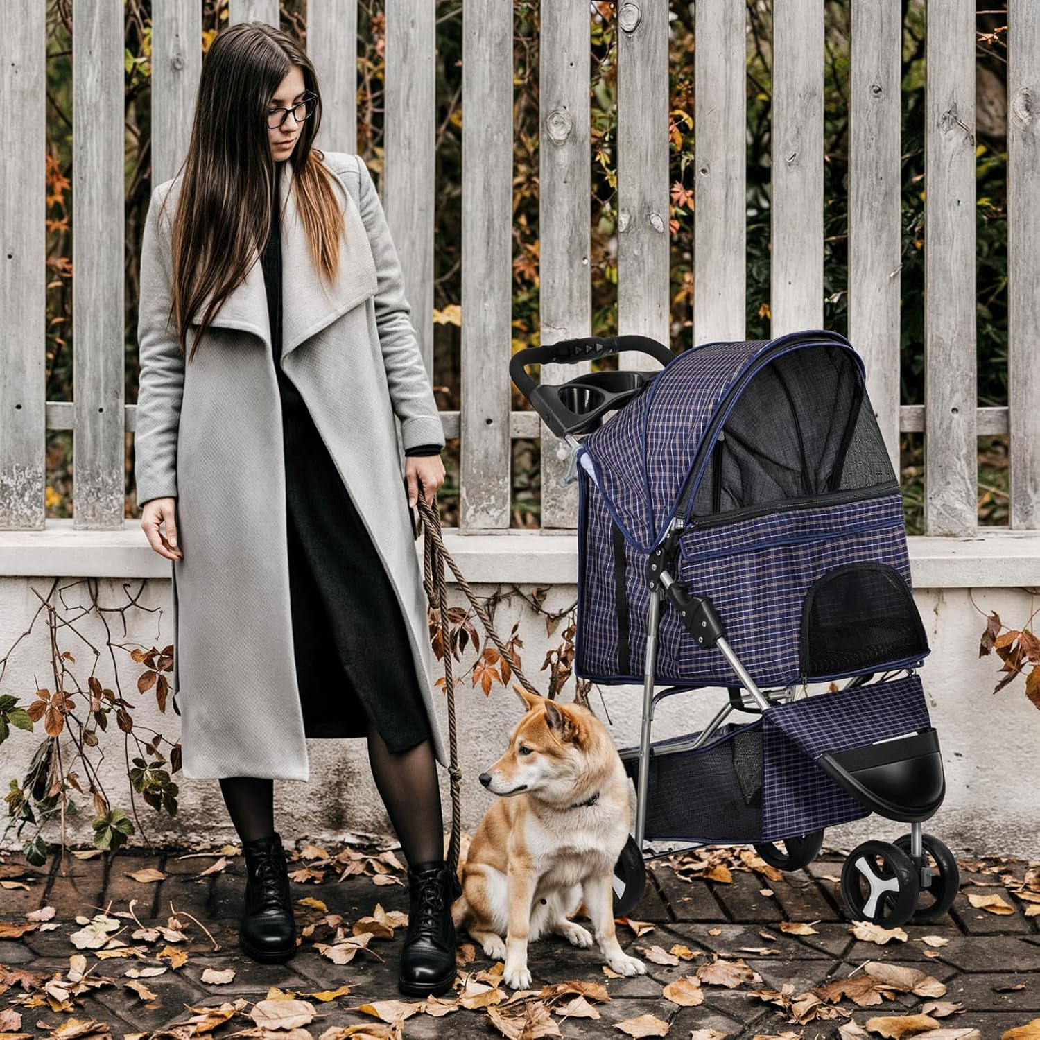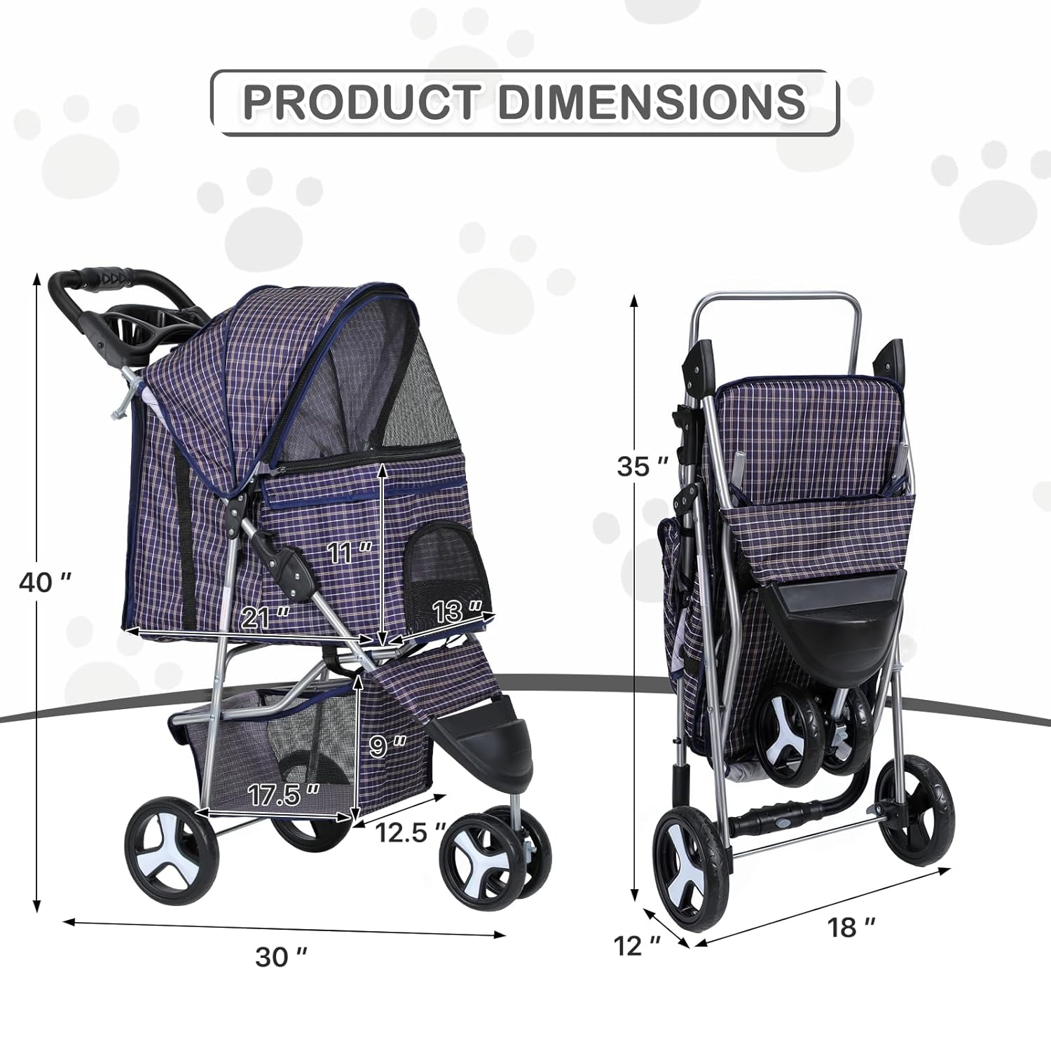 MoNiBloom 3 Wheels Pet Dog Cat Stroller for Small Medium Dogs Cats, Lightweight Foldable Jogger Stroller w/Storage Basket and Cup Holder, Plaid