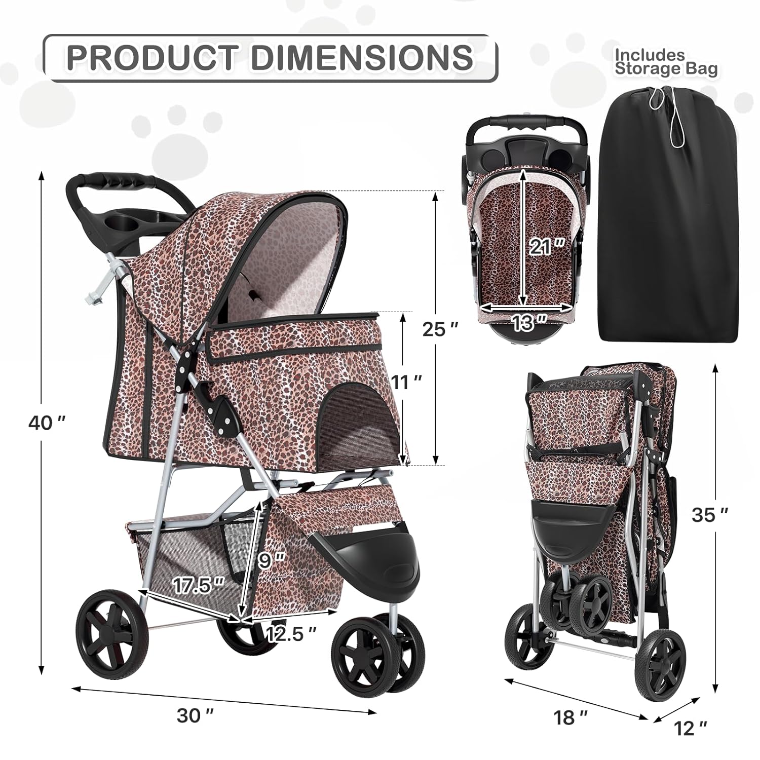 MoNiBloom 3 Wheels Pet Dog Cat Stroller for Small Medium Dogs Cats, Lightweight Foldable Jogger Stroller w/Storage Basket & Cup Holder, Leopard Print