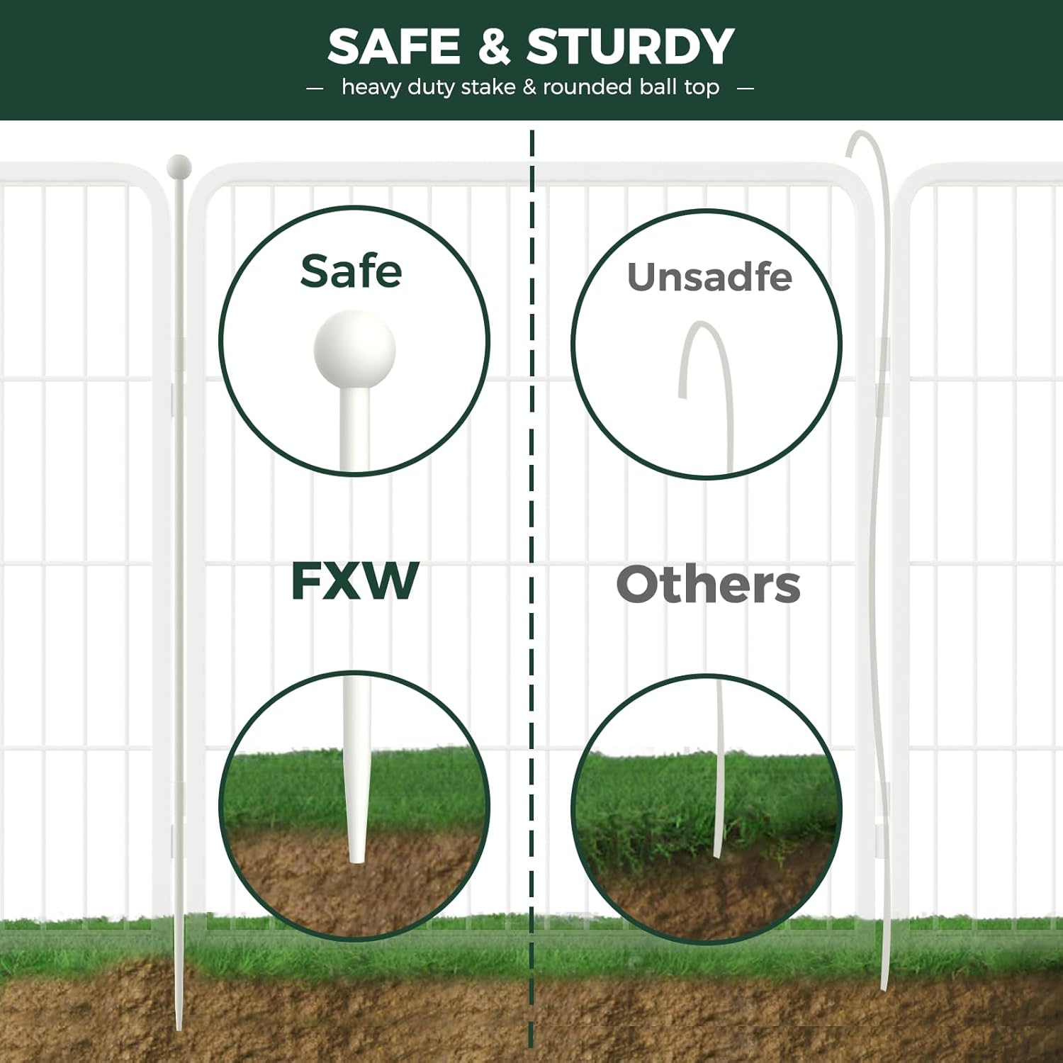 - Unlock your freedom, savor the moment: The stakes are designed with rounded ball tops to protect the dog's claws from injury. The rods are easily inserted into the ground for greater stability and rigidity, which won't collapse when the dog leans against them. Also, the automatic gravity-actioned locking mechanism will ensure you can open and close the door smoothly and reduces the chance of dogs unlocking by themselves. All of this is designed for absolute safety, so you can really relax.