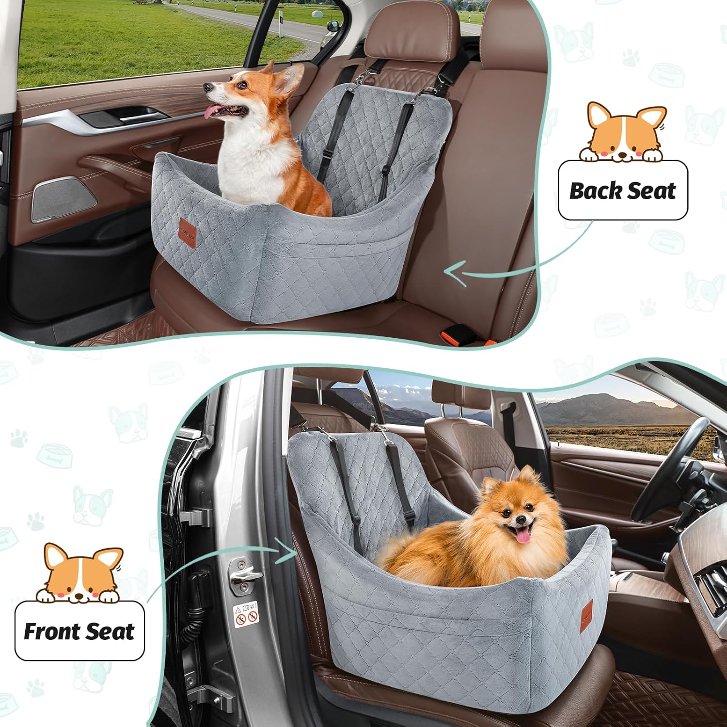- Security: The Lealchum dog car seat has multiple safety features: 1. It is designed with adjustable shoulder straps to prevent movement; 2 is equipped with two adjustable safety dog leashes, suitable for both a medium-sized dog and two small dogs; 3 is the anti slip fabric used at the bottom, effectively reducing the sliding of the car's braking inertia; The bottom of the car is equipped with a safety belt passage, which further ensures the stability of the pet car seat during driving.