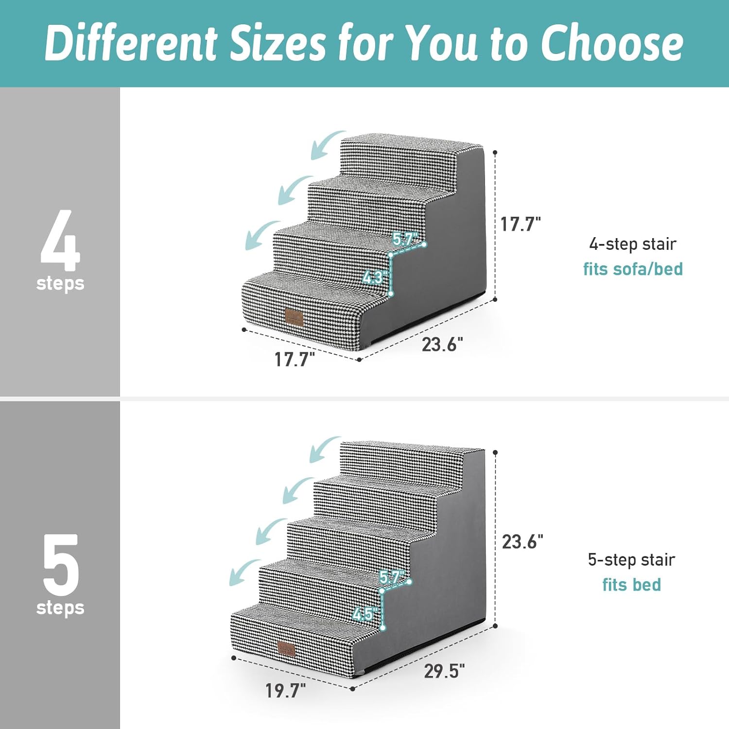 - Multiple Options: The dog stairs for small dogs are available in 4-step or 5-step, with various color choices to suit your needs. The 4-step stairs are ideal for sofas and low beds, while the 5-step dog ramp is better suited for high beds and car trunks.