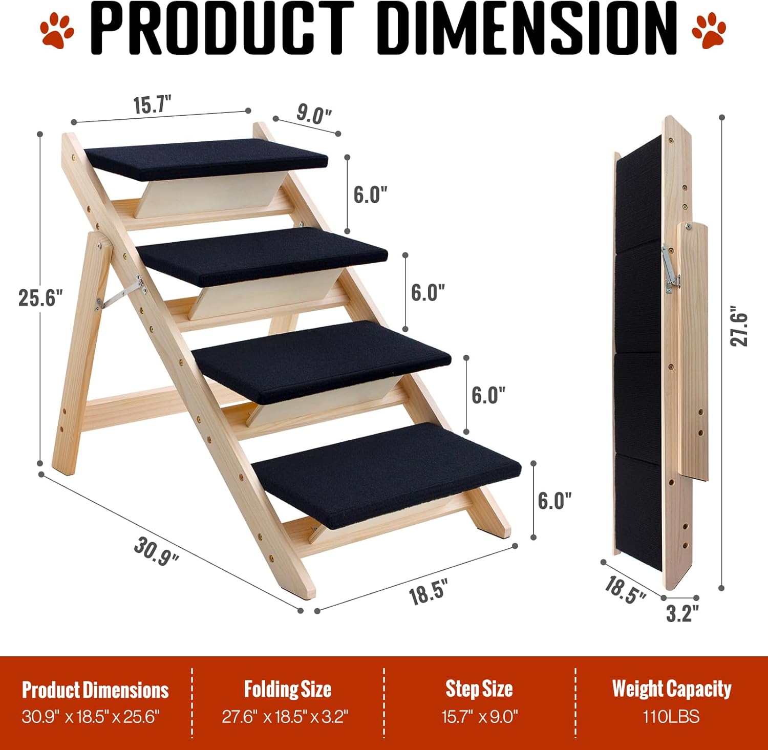- Product Dimension๏ผ30.9" L x 19.3" W x 25.6" H.The size of the staircase is designed according to the size of small and medium-sized dogs, which makes it safer and more comfortable to use.
