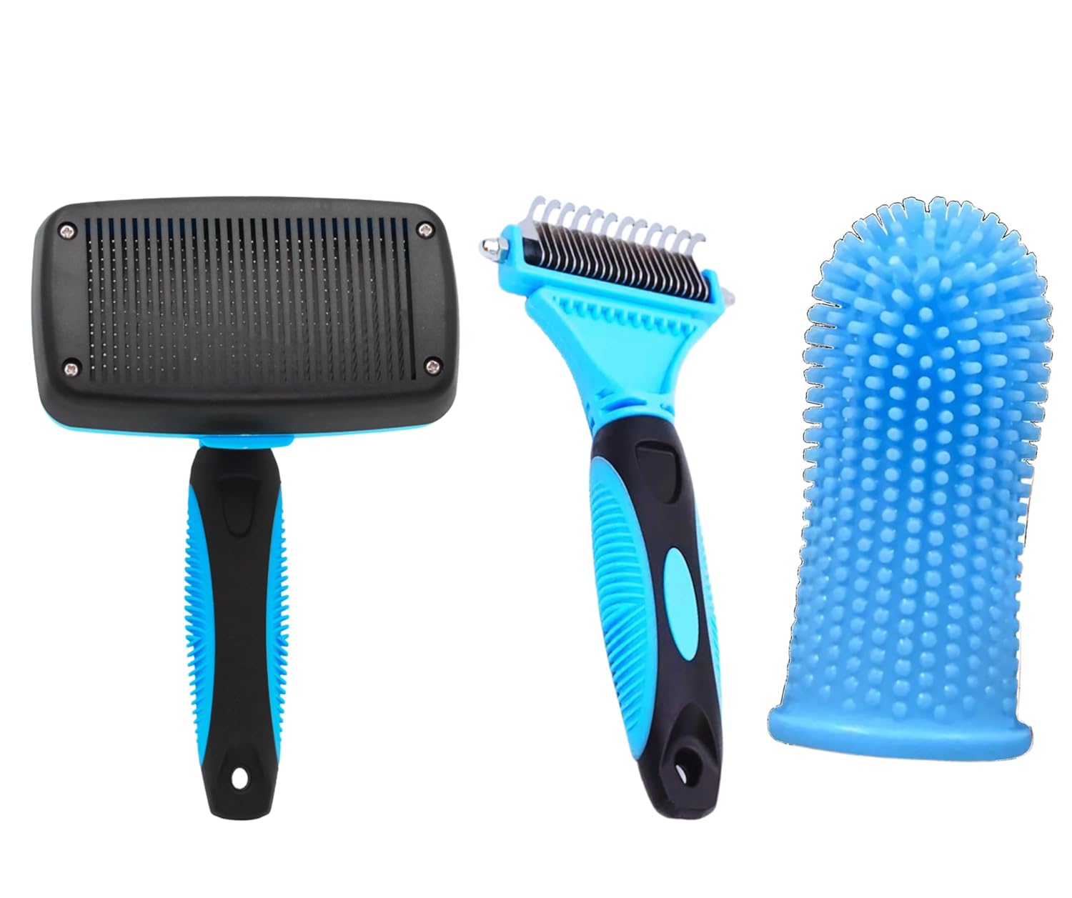 - COMPLETE 3-IN-1 PET GROOMING KIT: This all-in-one pet grooming kit includes a self-cleaning slicker brush for dogs, a durable undercoat rake for dogs, and a finger toothbrush for dental care. Itโs perfect for grooming, dematting, and maintaining hygiene for dogs, cats, and small pets at home.