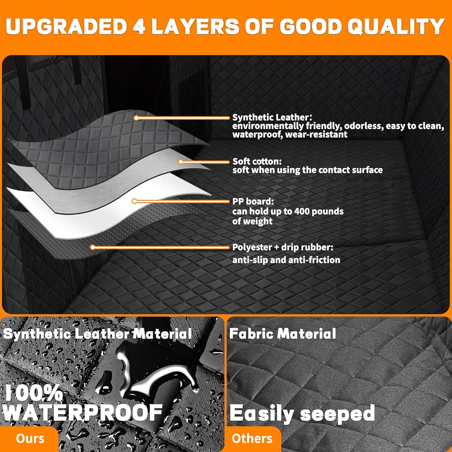 - WATERPROOF NON-SLIP MATERIAL:The rear seat extender is made of four high-quality materials. We have 3 PP hollow boards, which are soft and durable. The outside is a layer of Synthetic leather,which is odorless, shock-absorbing, and compounded with 5mm cotton. which has waterproof and anti slip effects.