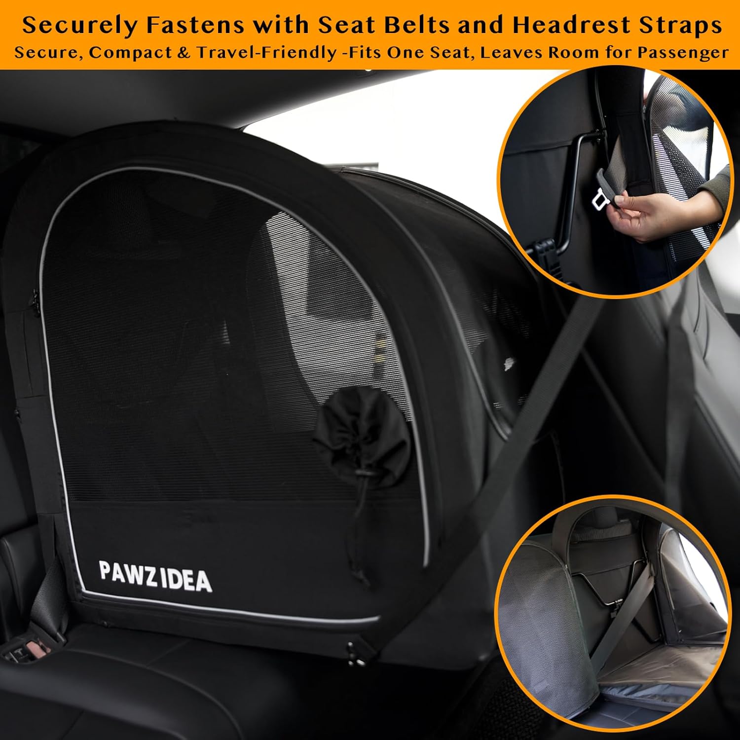 - Convenient Dual-Side Entry & Compact Design - Dog crate features doors on both sides, allowing easy pet access from either the driver or passenger side of your vehicle. Compact enough to occupy a single car seat, leaving ample space in the rear for human passengers. Install fabric cover first (align all 6 holes). Fully expanded and tested for stability, close the crate. Place on car seat, expand again, and secure with seat belt & headrest strap.
