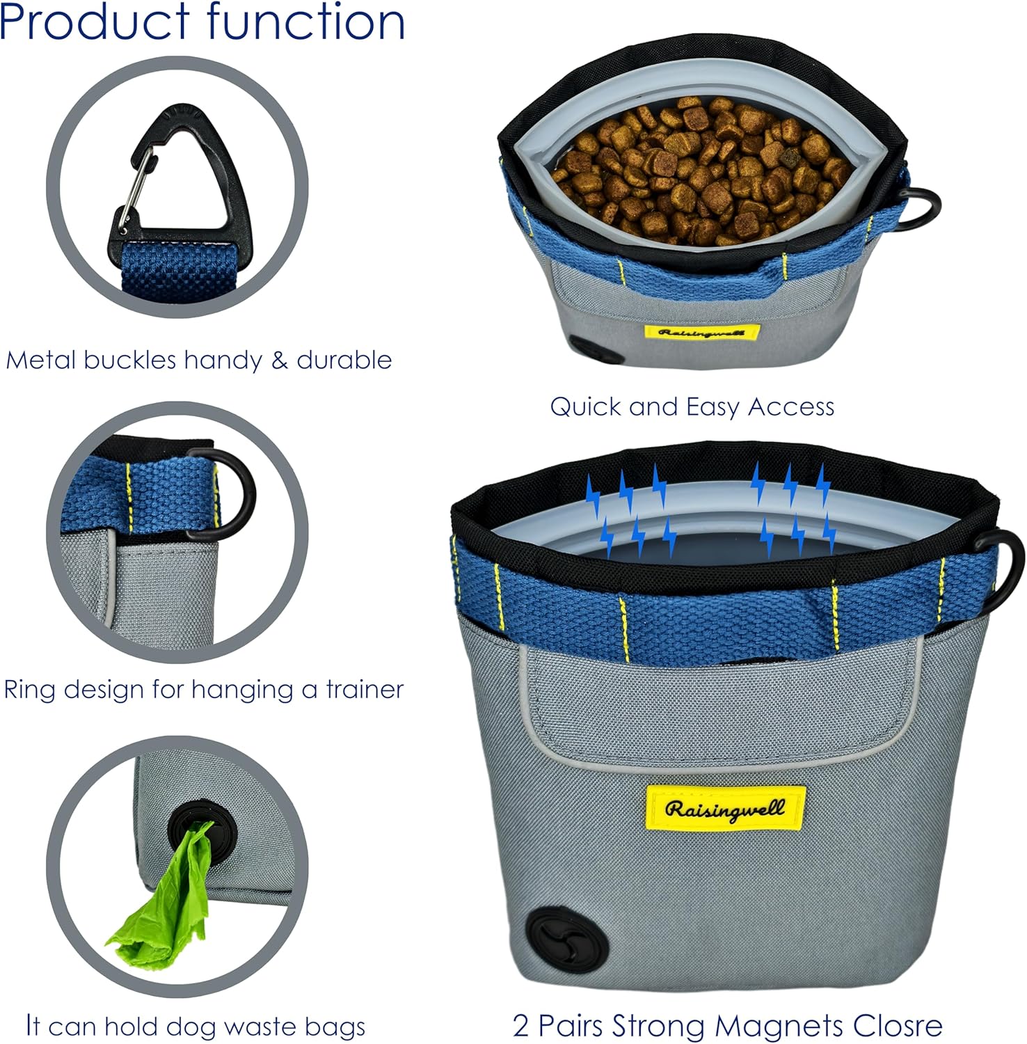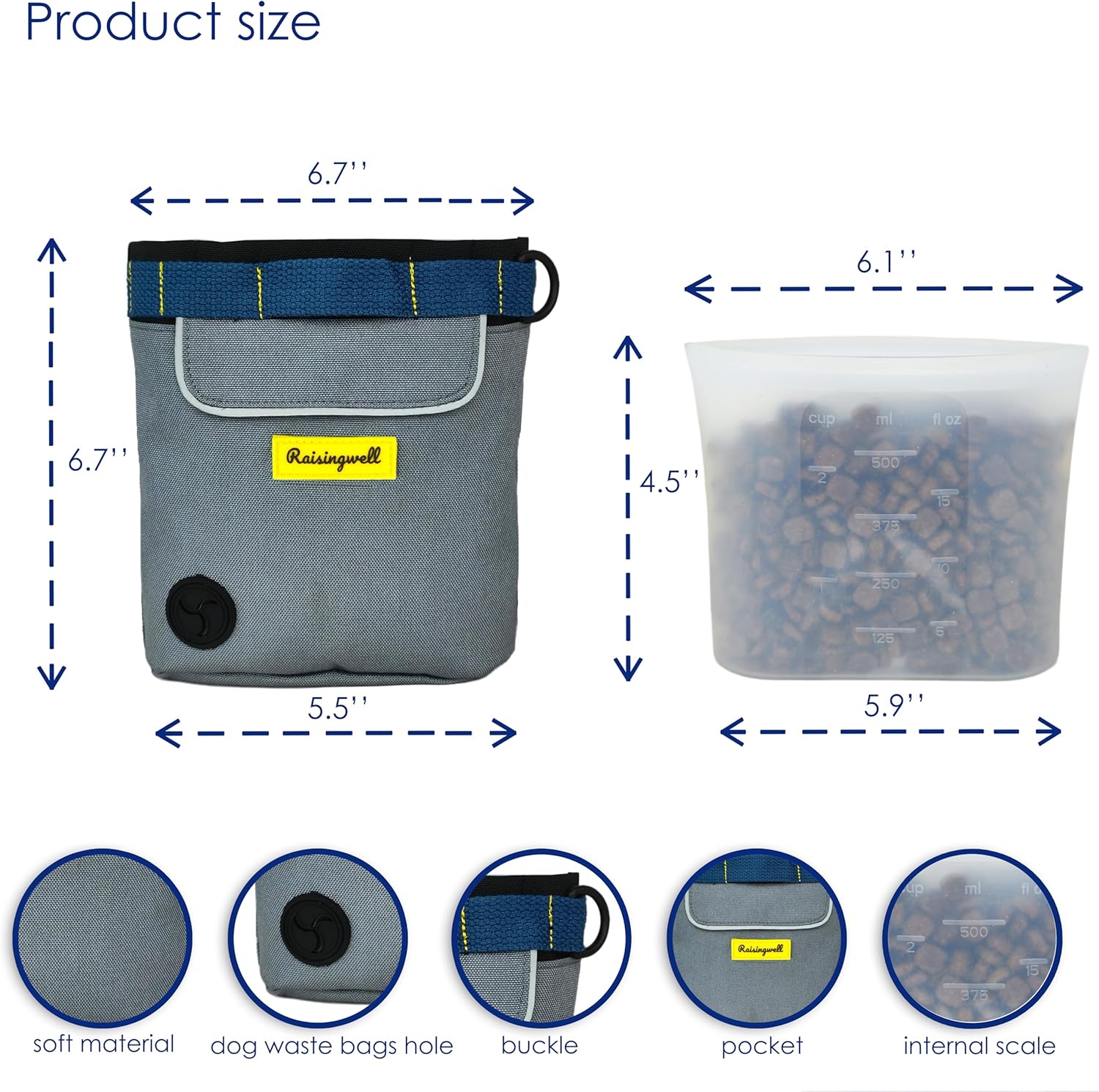 - 5.Durable Tech Material: Raisingwell's dog treat training pouch is made from durable, washable, and non-toxic fabric. Notably, its waterproof lining solves the problem of difficult-to-clean interiors of training bags, making it a great choice for your dog treat bag or dog treat fanny pack.
