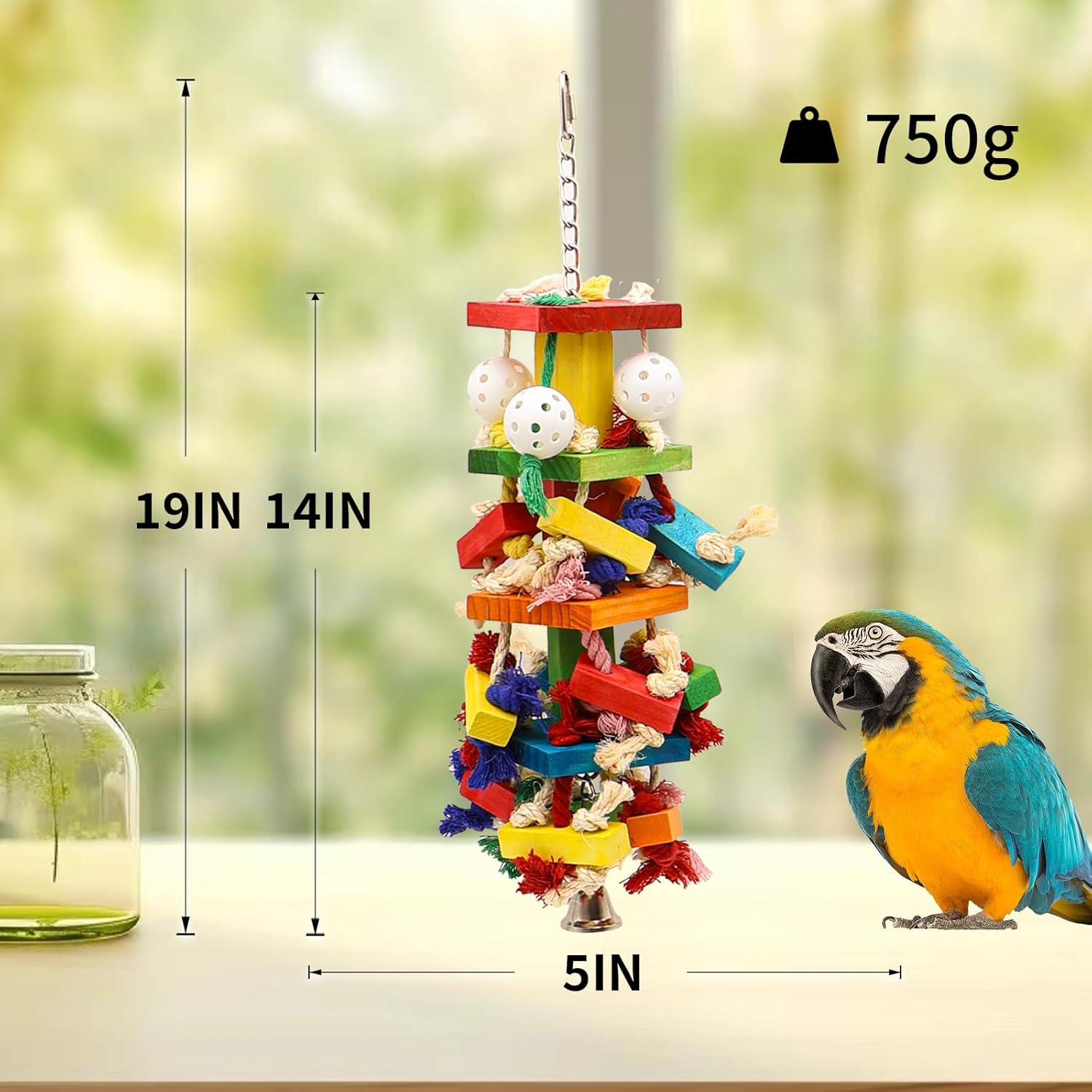 - STURDY & LONG-LASTING CONSTRUCTION Built to withstand vigorous play, our chew toy features reinforced stainless steel chains, durable poplar wood blocks. The integrated stainless steel bell adds auditory enrichment while maintaining structural integrity for persistent chewers like cockatoos and macaws.
