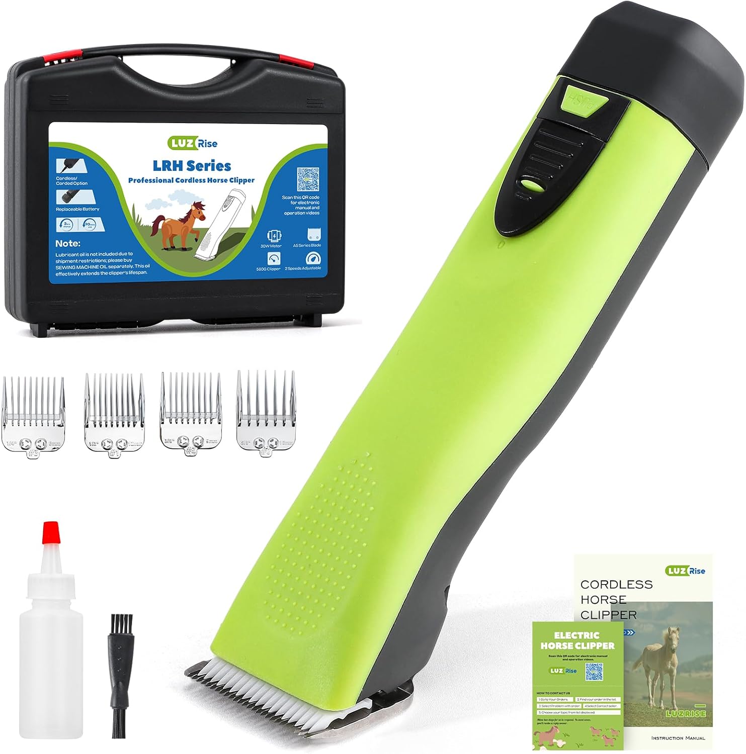 - [PACKING LIST]: 1 x Electric horse clipper; 4 x Magnetic guide combs; 1 x Charger; 1 x Cleaning brush; 1 x Oil bottle (WITHOUT oil); 1 x Replacement blade drive part; 1 x Durable carriage case; 1 x Operating manual. PLEASE NOTE: Lubricant oil is not included due to shipment restrictions; please buy SEWING MACHINE OIL separately. This oil effectively extends the clipperโs lifespan.