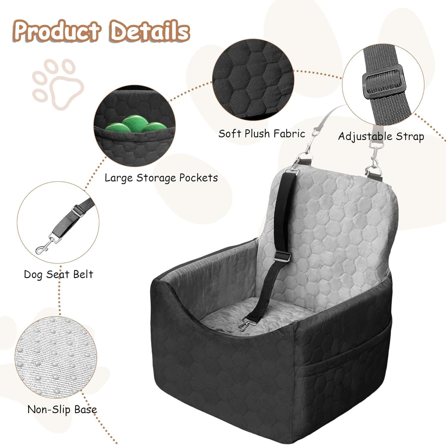 Dog Car Seat for Small/Medium Dogs - Dog Booster Seat with Safety Straps & Non-Slip Base, Travel Pet Car Seat with Storage Pockets, Washable & Removable, Suitable for Dogs Under 35 lbs (Black&Gray)