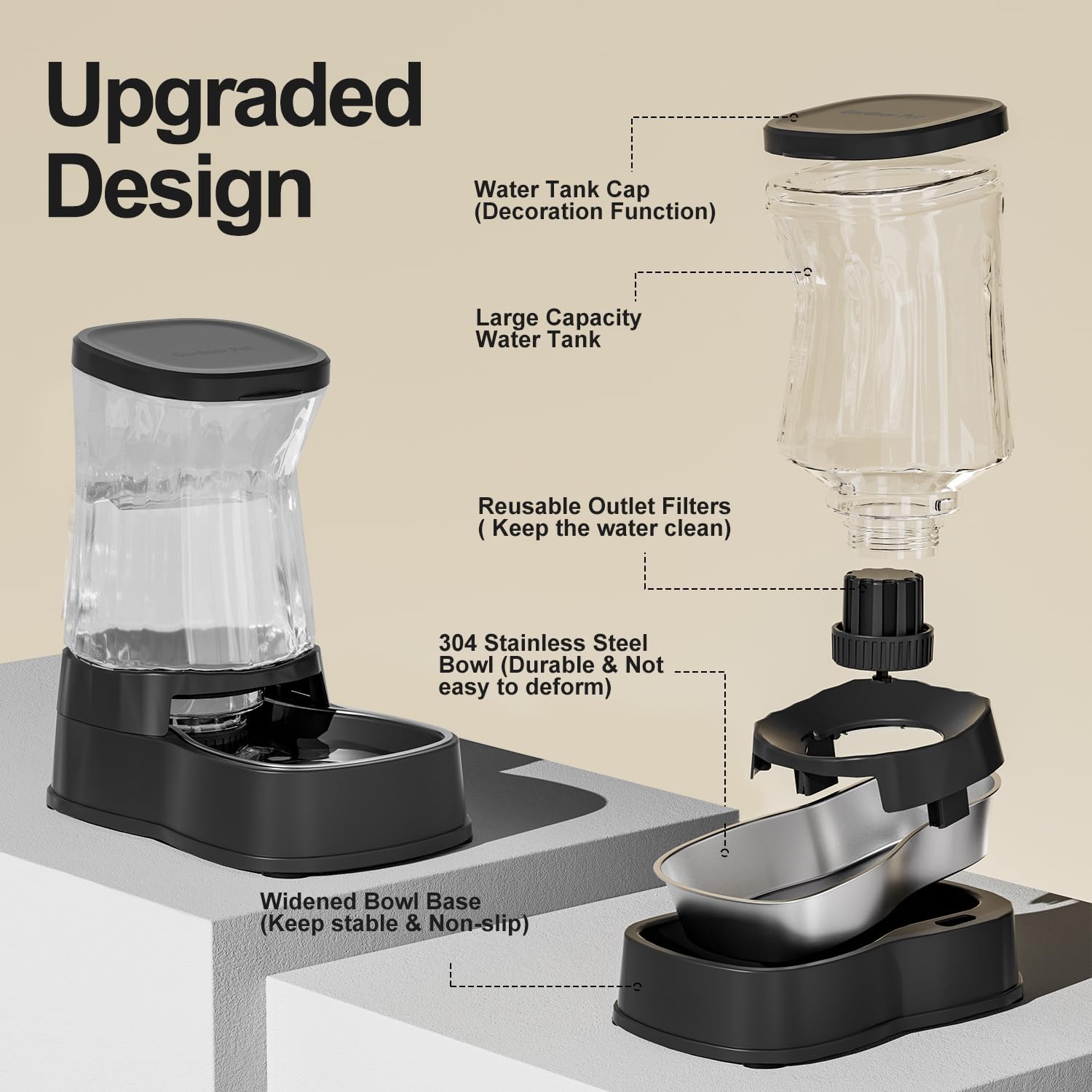 - 【Keep Stable】-The base of the water feeder has been upgraded to a widened design, with a non-slip design to prevent pets from tipping over the feeder while drinking. The water bottle is tightly integrated with the base, and the deepened water bowl prevents water from overflowing, providing your pet with a better drinking experience.