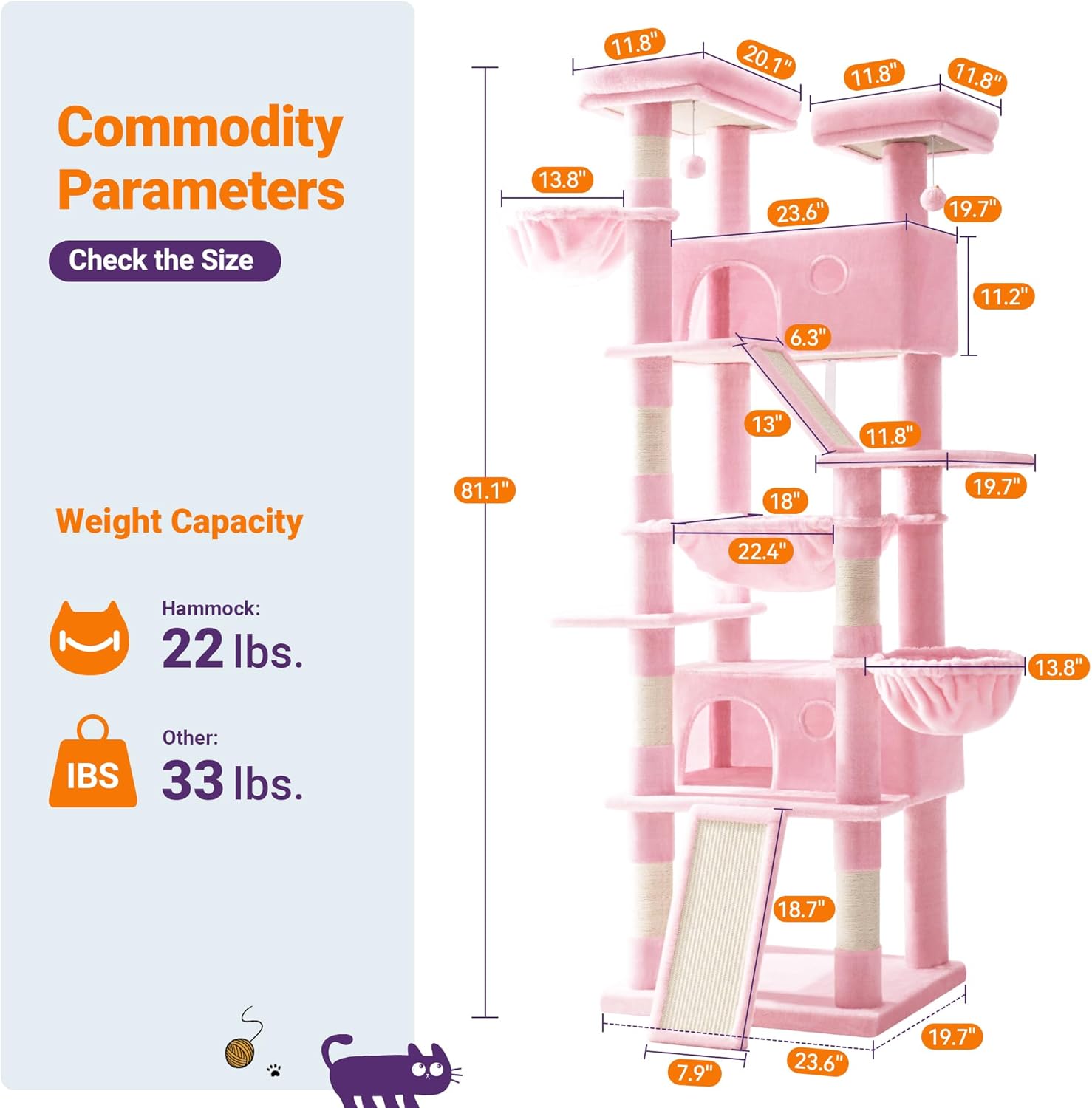 - Multifunctional Activity Center: This cat tree offers various functions for cats, including 2 perching platforms, 2 comfortable condos, and an oversized hammock. Whether climbing, resting, or scratching, the cat's needs are met