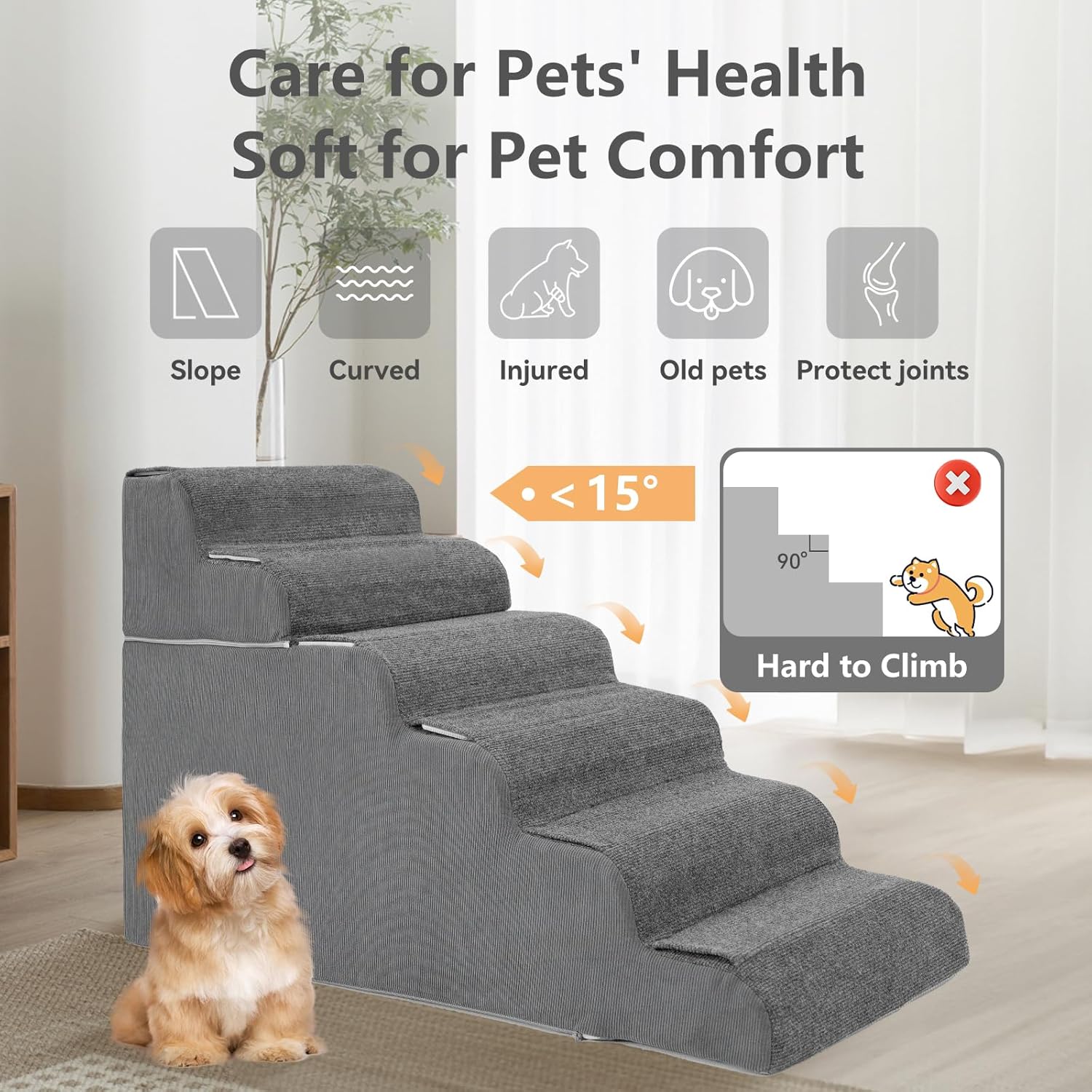 - Customizable Height for Every Adventure: Our dog stairs with 6-step and 7-step designs ,which is uniquely crafted to adapt to your pet's needs. The modular design allows for easy assemblyβsimply zip or unzip the sides to create a 4+2 or 4+3 configuration. Whether your pet needs a gentle incline or a higher climb, these stairs grow with them, offering comfort and confidence every step of the way
